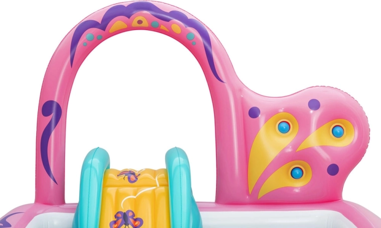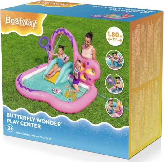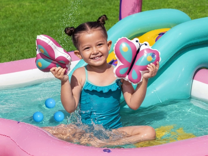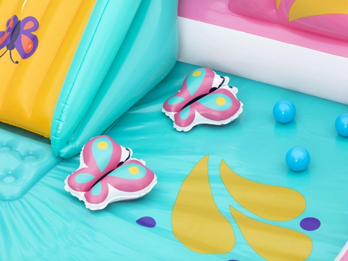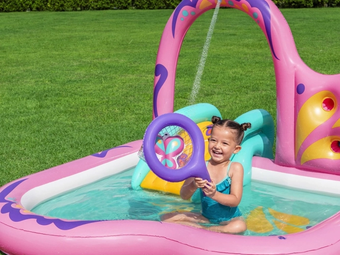 Centrul de joacă acvatic gonflabil Bestway Fluture transformă grădina într-un loc sigur, plin de bucurie. Datorită dimensiunilor compacte de 180 × 180 × 117 cm încape și în spații mai mici, oferind totuși multe activități: alunecare într-o zonă puțin adâncă pentru stropit, duș din arc conectat la furtunul de grădină și orificii pentru aruncarea și sortarea mingiuțelor, care dezvoltă motricitatea fină.