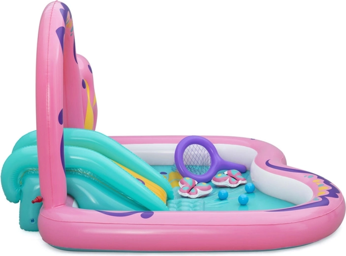 Înveselește zilele de vară cu centrul de joacă Bestway Fluture – un loc de joacă acvatic adorabil, sigur și distractiv pentru copii de la 2 ani. Oferă un tobogan moale, un duș arcuit pentru o răcorire delicată și orificii pentru sortarea mingiuțelor interactive. Designul pastelat, colorat și accesoriile gonflabile susțin mișcarea, coordonarea și jocul creativ în grădină.