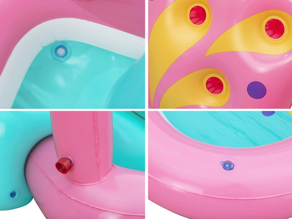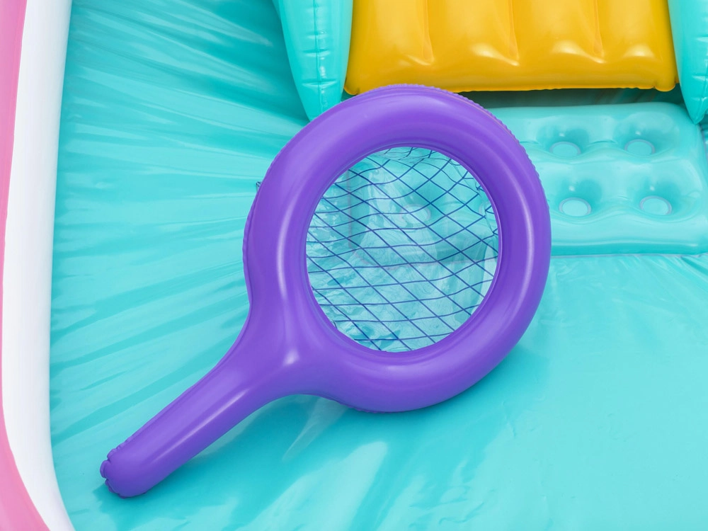 Sunt incluse jucării plutitoare distractive și elemente gonflabile în formă de fluturi și inele. Pereții moi și aterizările căptușite sporesc confortul și siguranța. Vinilul rezistent se curăță ușor, iar peticul de reparare inclus prelungește durata de viață. Doar conectezi furtunul, umfli și distracția poate începe.
