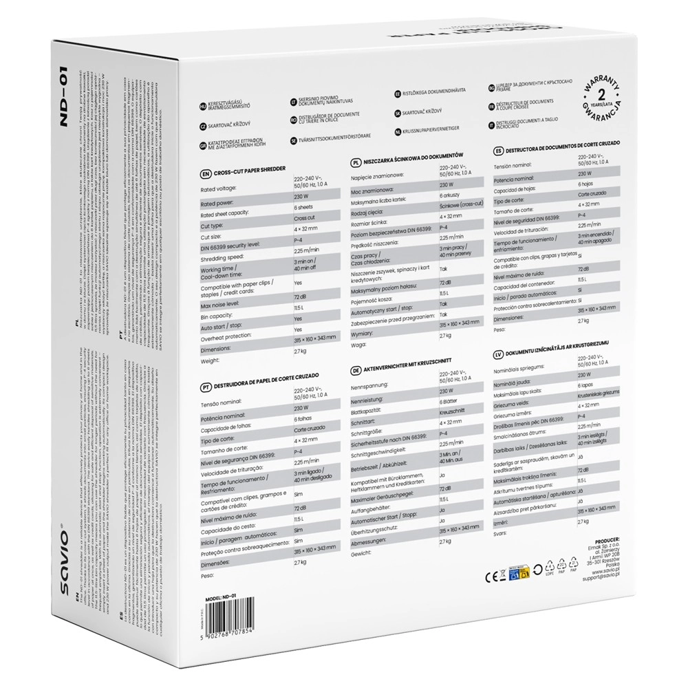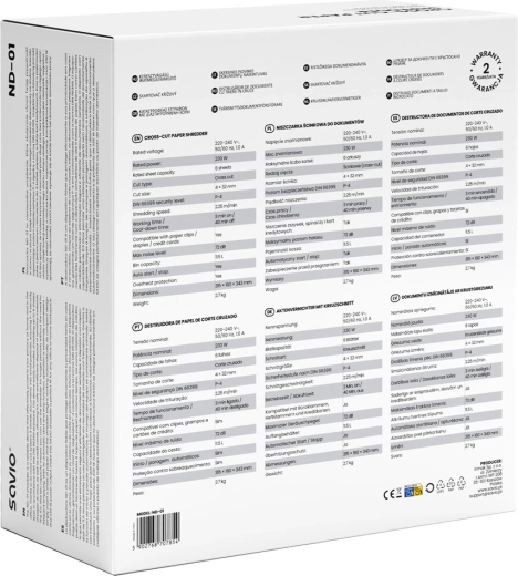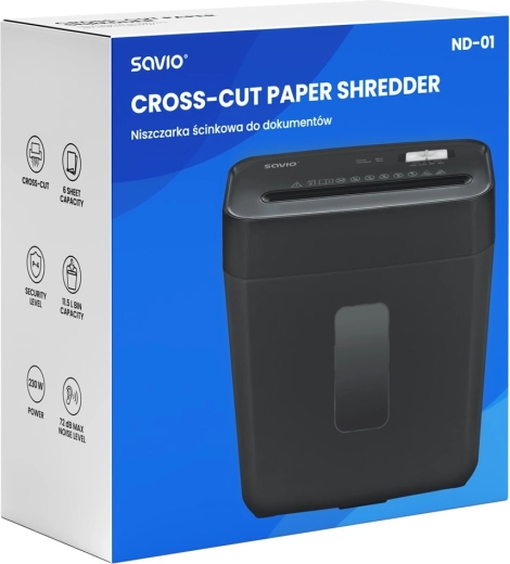 Distrugătorul compact ND-01 îți protejează confidențialitatea datorită tăierii transversale (cross-cut) 4 × 32 mm și clasei de securitate P-4. Procesează până la 6 foi simultan, face față agrafului, capselor și cardurilor de plată, are un coș de 11,5 l și funcționează silențios, în jur de 72 dB – ideal pentru acasă și pentru birouri mici.