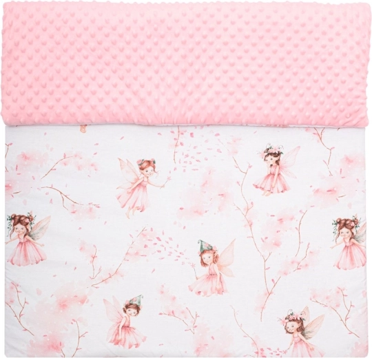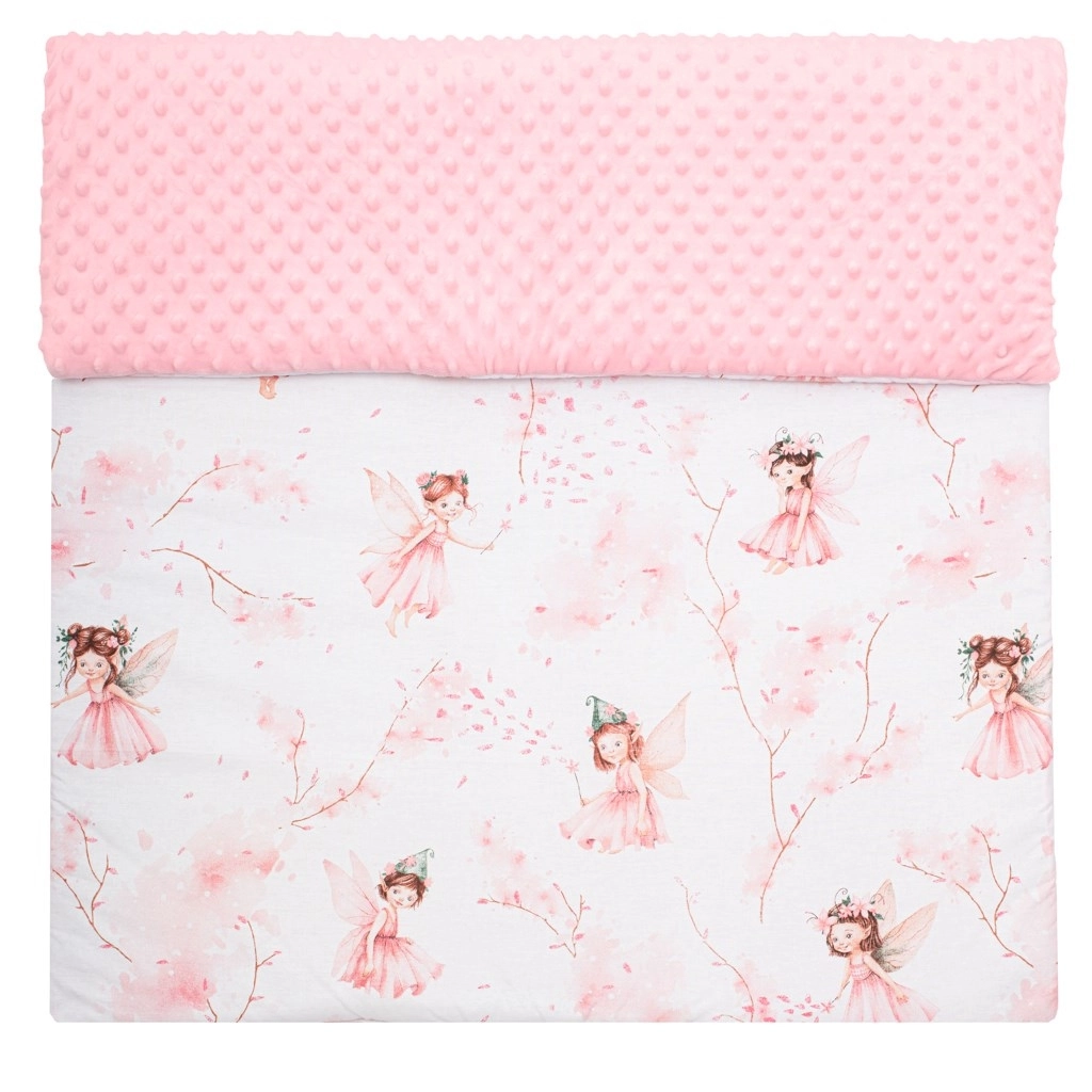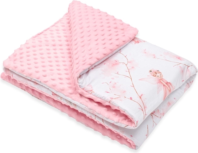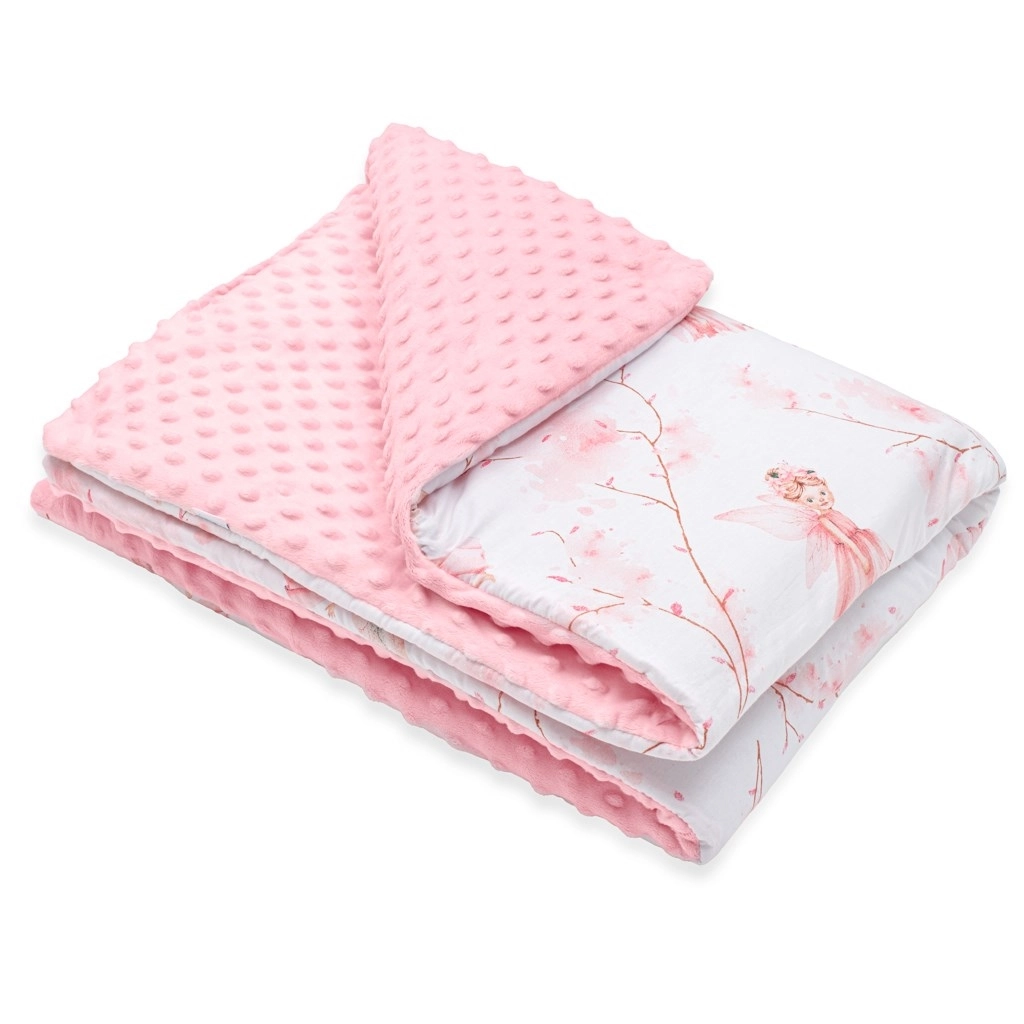 Păturica moale pentru copii New Baby, cu motiv de zâne, combină delicata țesătură minky cu buline 3D pentru stimulare senzorială și bumbac 100% respirabil, cu imprimeu fin. Datorită umpluturii antialergice, păturica este plăcut călduroasă, ideală pentru cărucior, pătuț și scaun auto. Nu lasă culoare, este blândă cu pielea sensibilă și nu are nasturi sau elemente rigide, pentru siguranță maximă.