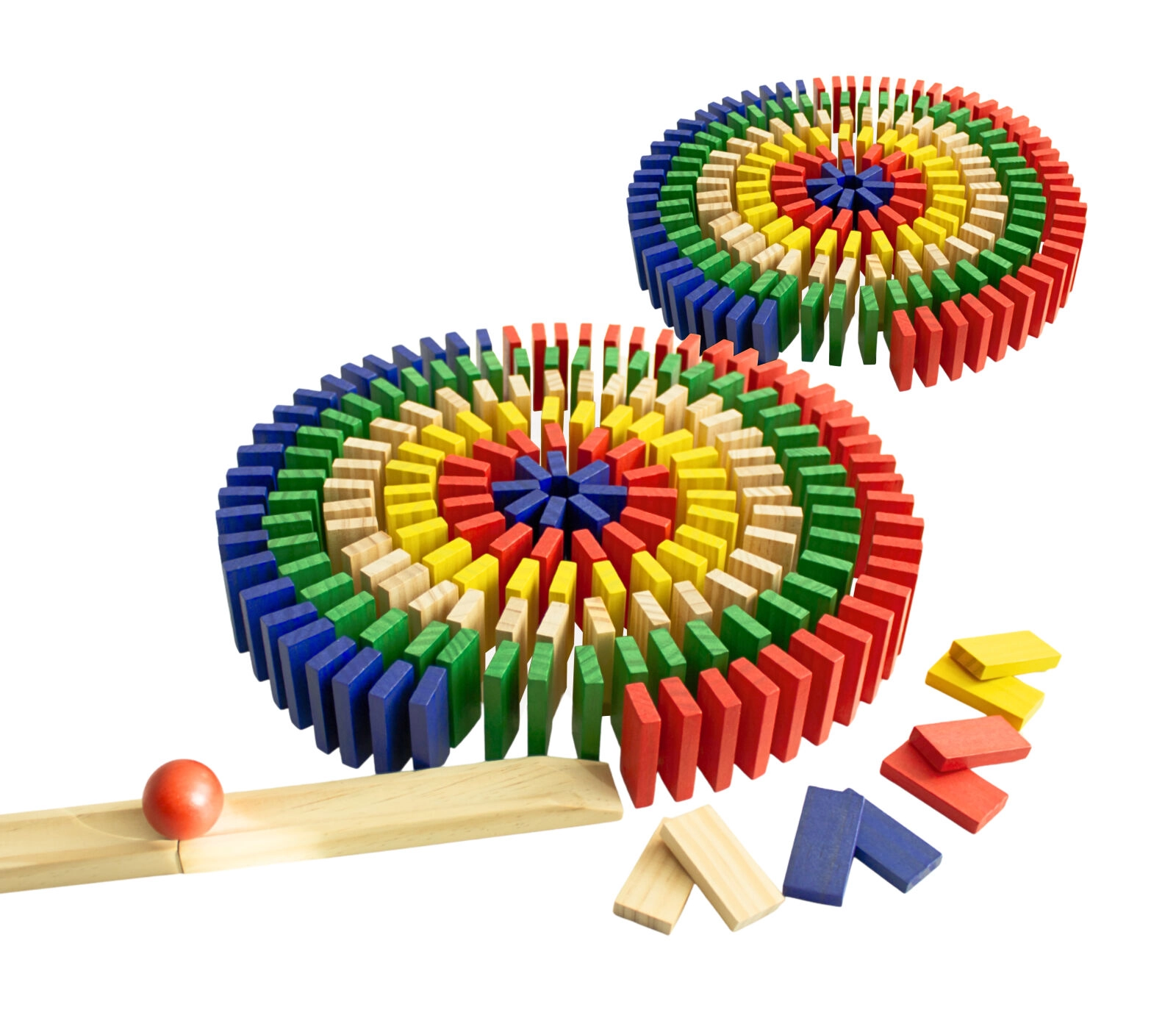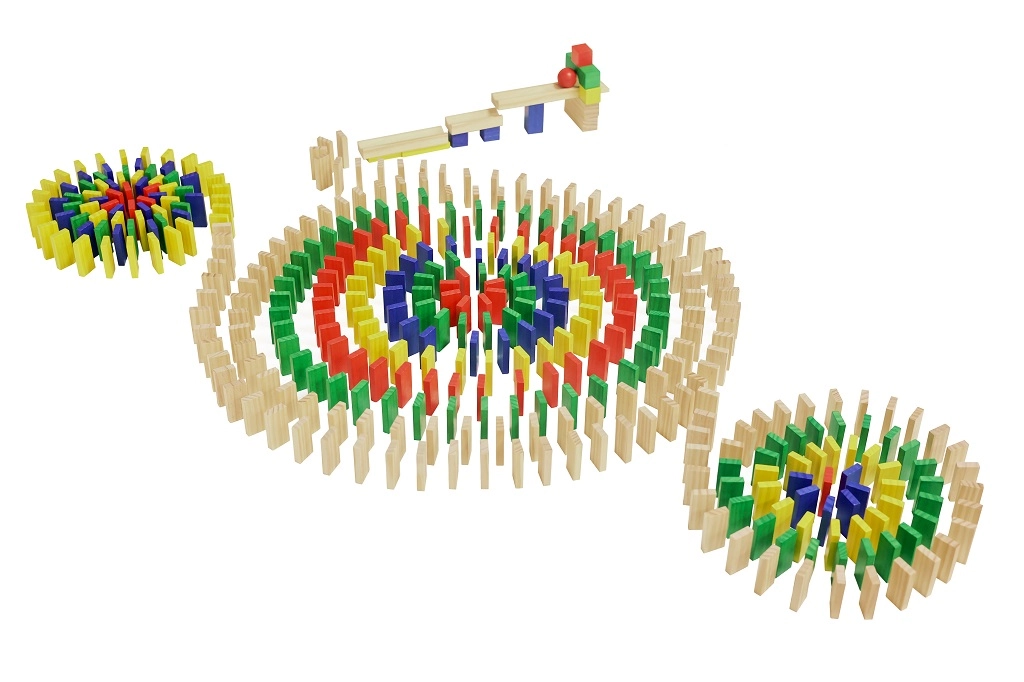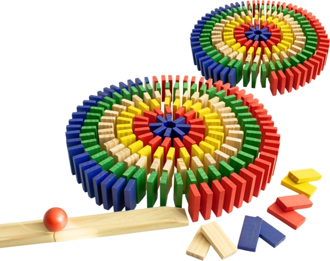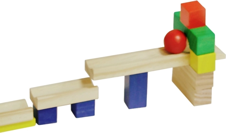 Include o rampă din lemn și o bilă pentru un start spectaculos al domino-ului. Urmărește doborârea lină și stabilă a pieselor.