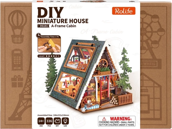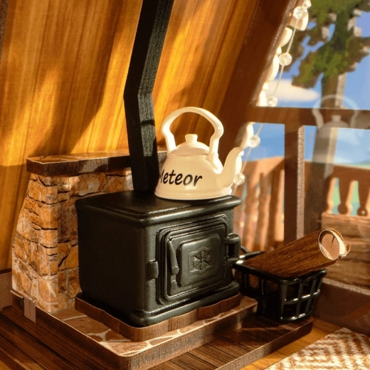 Adu atmosfera glampingului modern chiar la tine acasă. Modelul de căsuță cu acoperiș în două ape impresionează prin pereți mari vitrați, fereastră care se deschide și un interior bine gândit: living luminos, sufragerie complet echipată, scară din lemn și dormitor mansardat. Nu lipsesc balconul cu mini-grădină, cuptorul din lemn, rame decorative sau chitara – fiecare detaliu va încânta iubitorii de miniaturi.