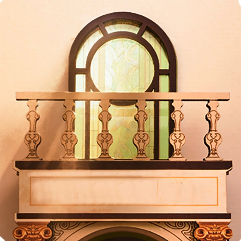 Acest book nook impresionant îmbină arhitectura victoriană, coloane romane, balcoane și vitralii într-o scenă miniaturală plină de atmosferă. În interior veți găsi biblioteci din lemn roșu, o poartă boltită, un tejghea din mahon cu o carte deschisă și un candelabru LED funcțional pentru o iluminare primitoare.