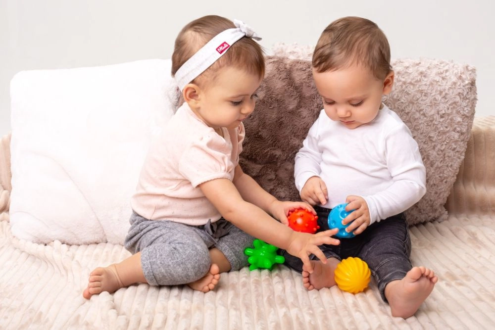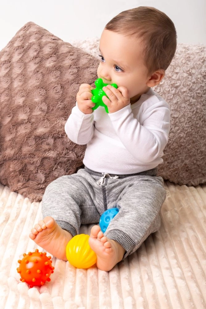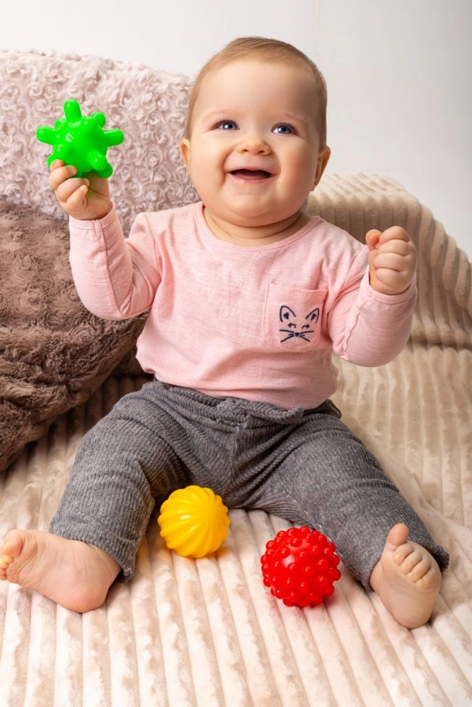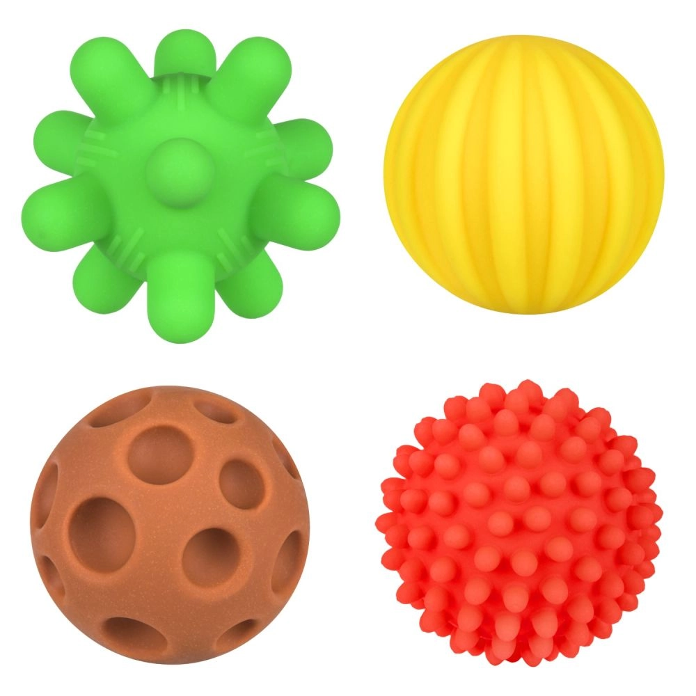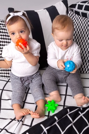 Fiecare bilă oferă o suprafață distinctă pentru stimularea atingerii, masajul palmelor și antrenarea prinderii – ideal pentru dezvoltarea motricității fine.