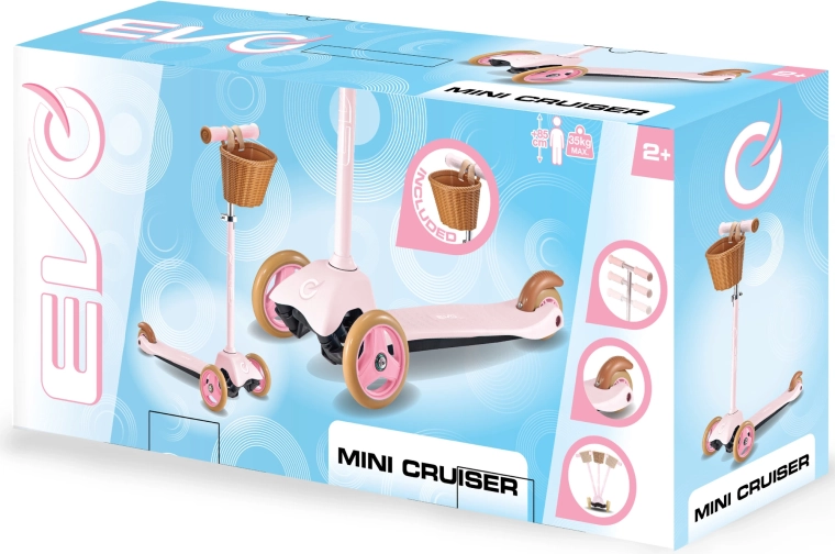 Trotineta EVO Mini Cruiser sprijină dezvoltarea naturală a echilibrului – virarea se face prin înclinarea corpului, astfel încât copiii exersează cu ușurință coordonarea și siguranța la mers. Două roți frontale mai mari și una spate, cu rulmenți ABEC-5, oferă o deplasare stabilă și silențioasă, de agrement pe suprafețe drepte, în timp ce frâna de picior deasupra roții din spate asigură opriri sigure și intuitive.