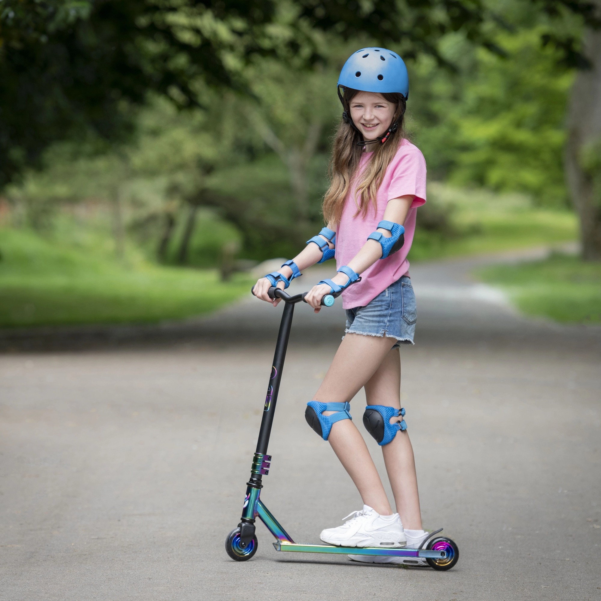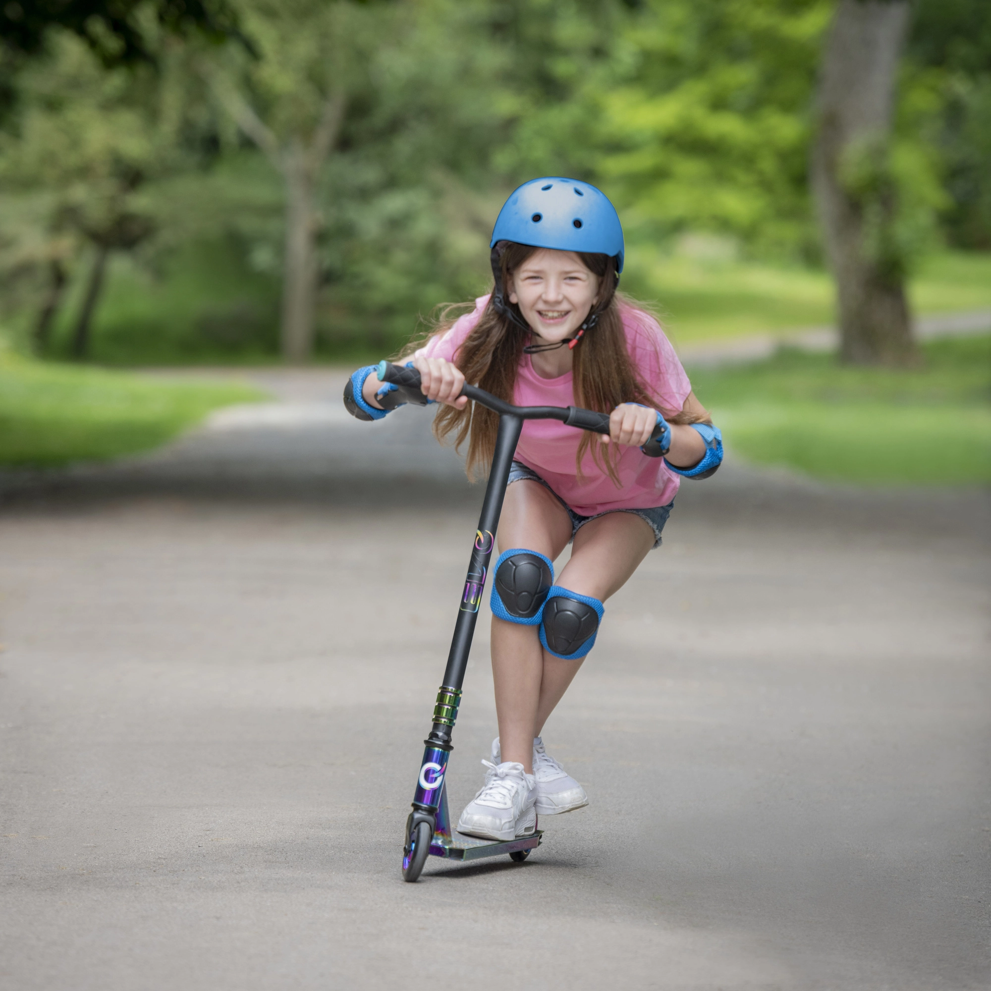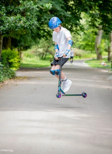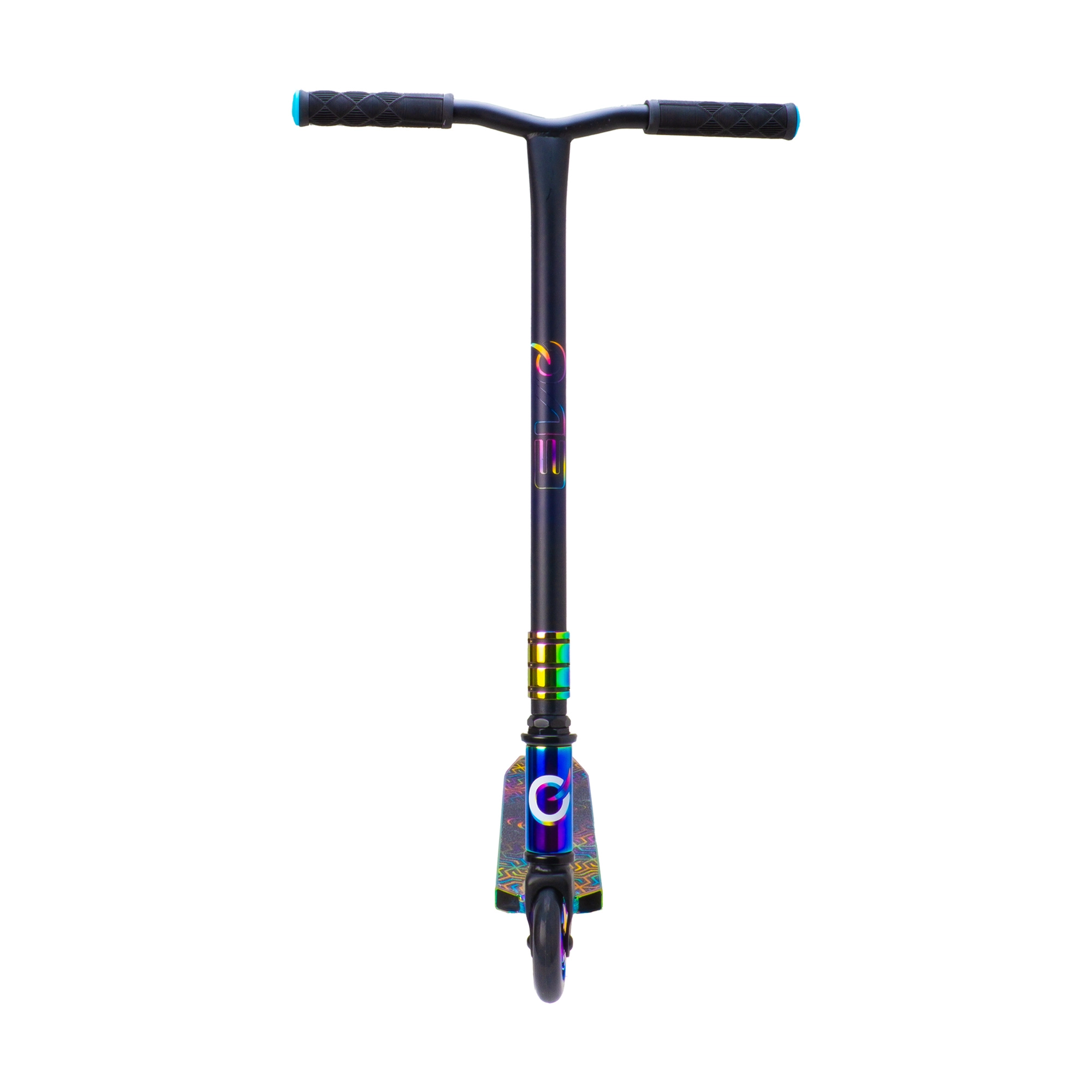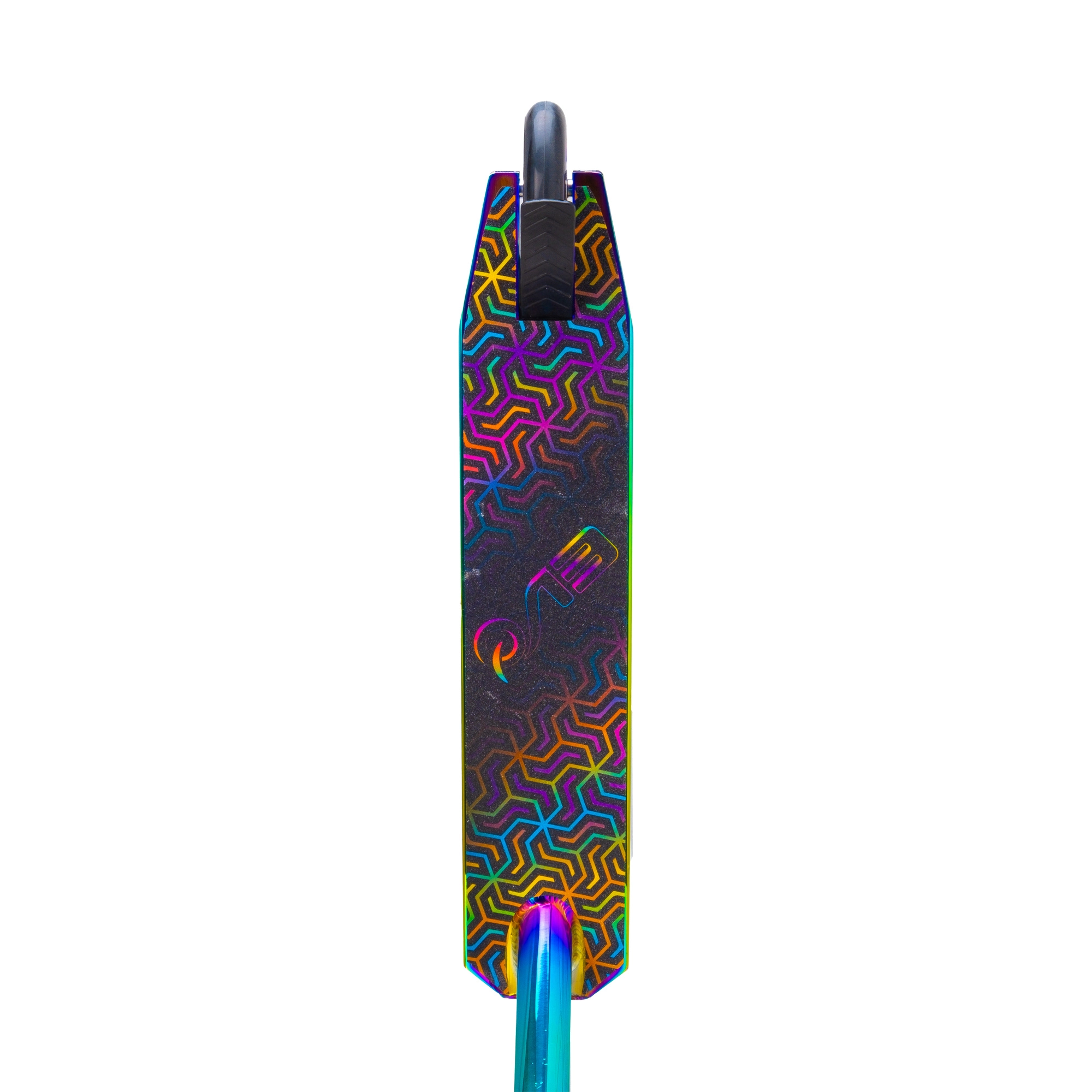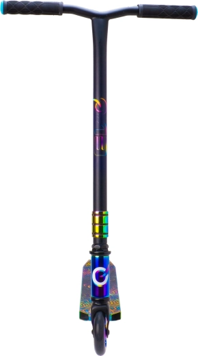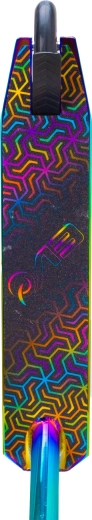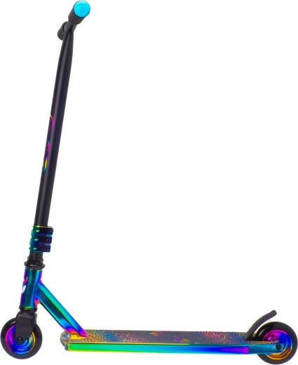 Execuția irizată (curcubeu) a deckului, furcii și clemei oferă trotinetei un aspect inconfundabil și motivează la mers.