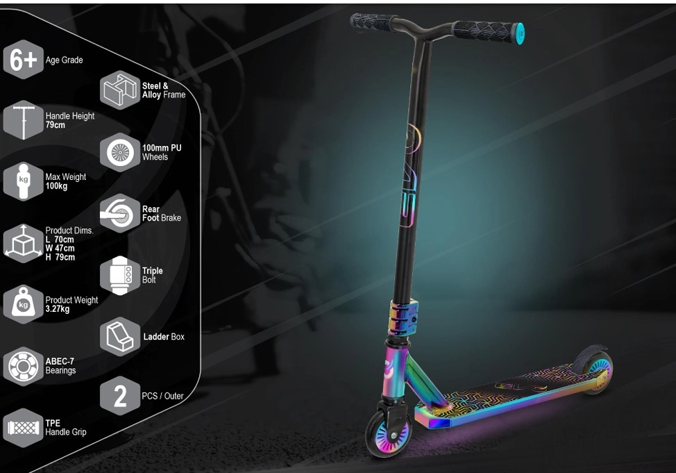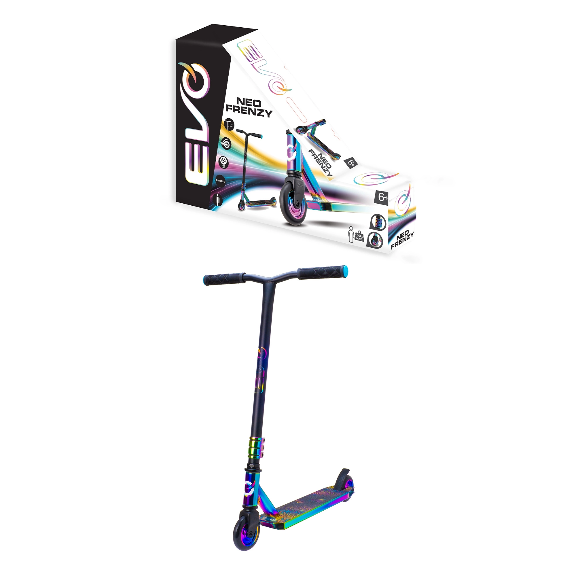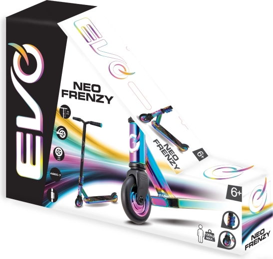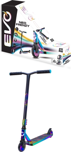 Trotineta freestyle EVO Neo Frenzy pentru copii de la 6 ani oferă o construcție solidă pentru trick-uri, rulare lină datorită rulmenților ABEC-7 și un atrăgător aspect neo-chrome irizat. Include ghidon T-bar cu mânere confortabile, frână spate cu apăsare și miez metalic al roților pentru stabilitate și siguranță atât în parc, cât și în oraș.