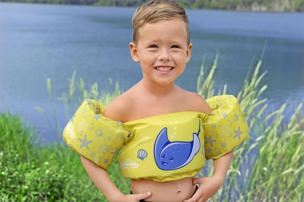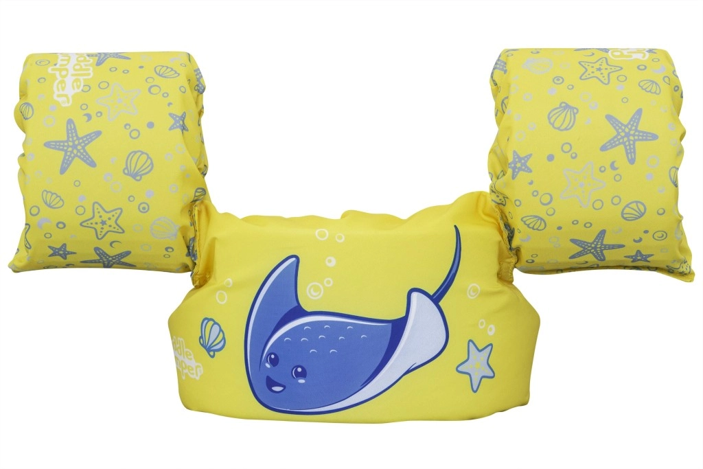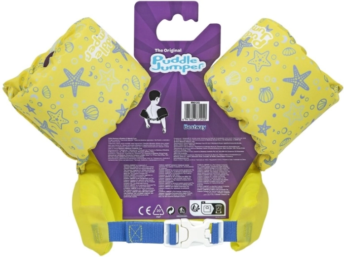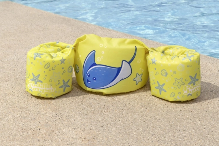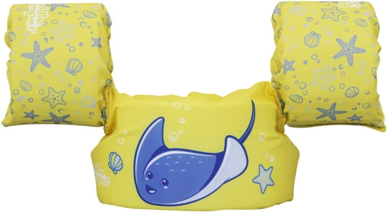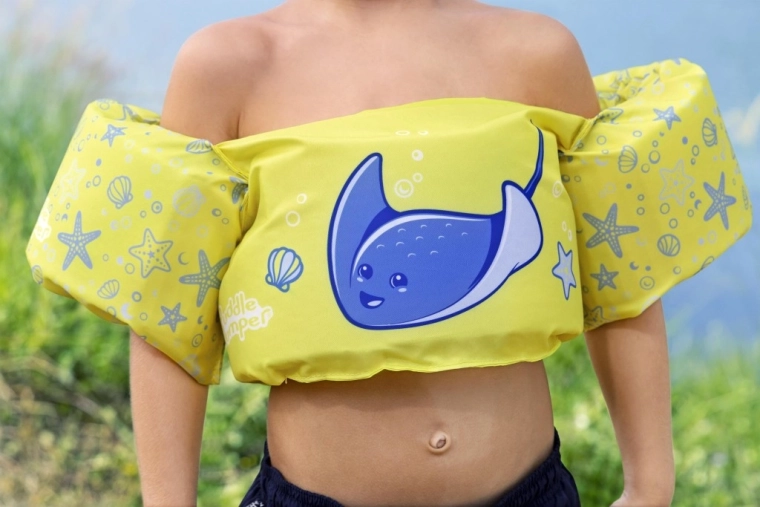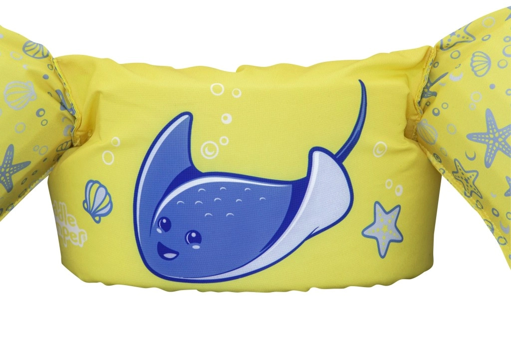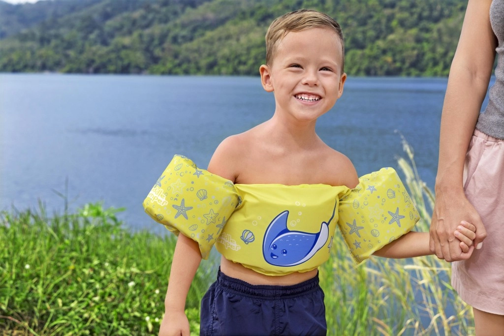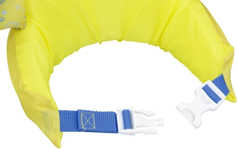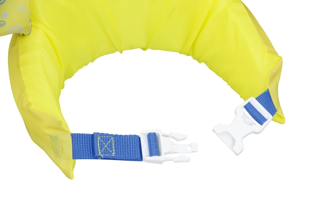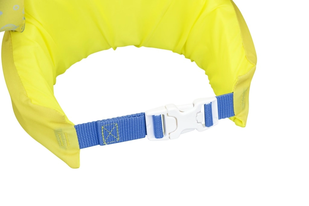 Mânecuțele înfășoară bine brațele și ajută la stabilizarea poziției copilului, în timp ce catarama din spate, cu curea reglabilă, asigură o prindere sigură, rezistentă la desfacere. Vesta este ușoară, ușor de transportat și rezistentă la apă și soare – ideală pentru vacanță, piscină de grădină sau ștrand.