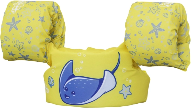 Vestă de înot pentru copii, ușoară și confortabilă, cu mânecuțe, pentru vârstele 2–6 ani și greutatea 15–30 kg, oferă flotabilitate fiabilă, poliester moale și închidere sigură la spate. Designul vesel, galben, cu un rechin-de-mare albastru inspiră încredere la primele încercări de înot atât în piscină, cât și în ape naturale.