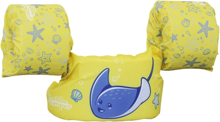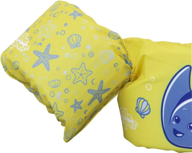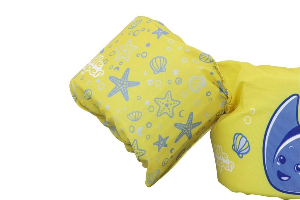 Această vestă de înot pentru copii, cu mânecuțe integrate, combină confortul poliesterului moale cu un sprijin sigur al flotabilității datorită umpluturilor din spumă de calitate. Culoarea galbenă intensă, cu rechin-de-mare albastru și motive marine, mărește vizibilitatea copilului în apă și invită natural la joacă acvatică.