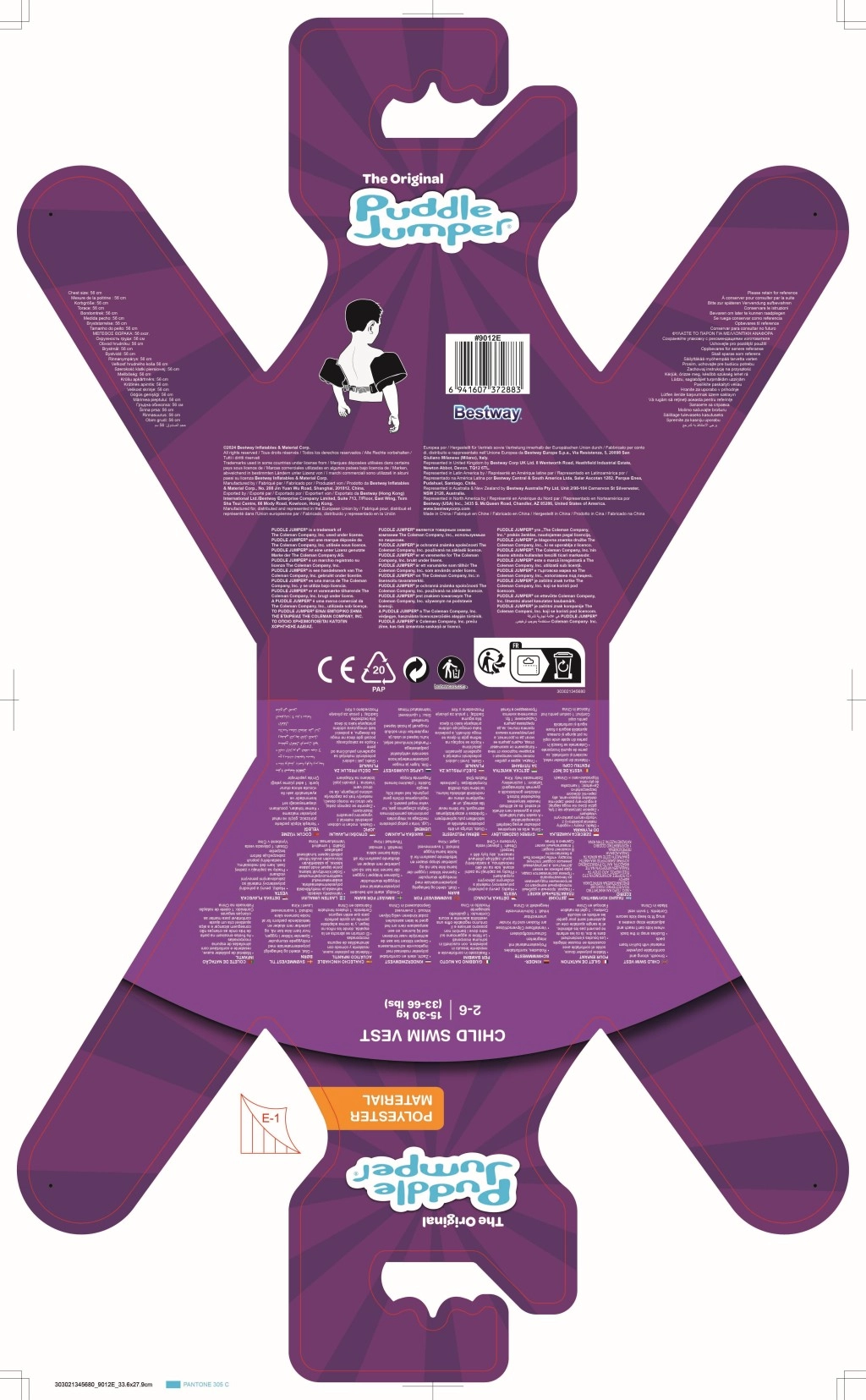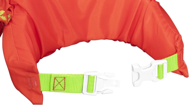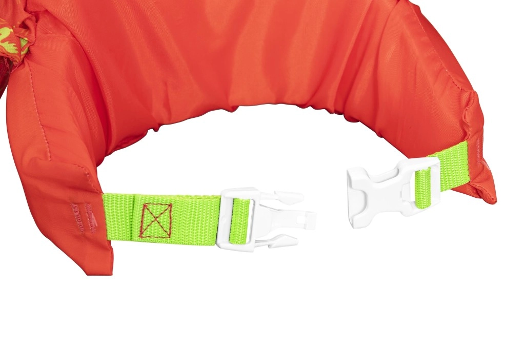 Țesătura din poliester, rezistentă și plăcută la atingere, împreună cu inserțiile din spumă oferă flotabilitate fiabilă fără disconfort. Cureaua dorsală reglabilă cu cataramă de siguranță asigură o potrivire fermă, astfel încât copilul să nu o poată desface singur.