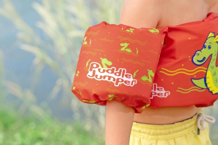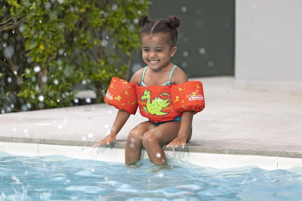 Culoarea portocalie intensă și motivul dragonului verde facilitează supravegherea copilului și îl motivează la joacă în apă.