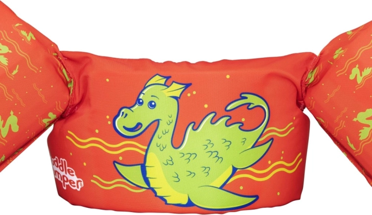 Această vestă de înot pentru copii, cu mânecuțe integrate, îi ajută pe micii înotători să-și păstreze poziția corectă la suprafață și le oferă încredere la primele brațe. Culoarea portocalie intensă, cu un motiv vesel de dragon verde, sporește vizibilitatea și ușurează supravegherea copilului.