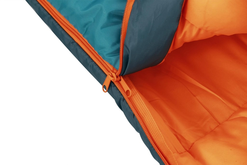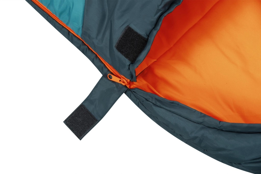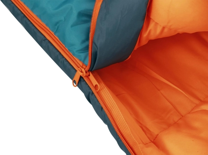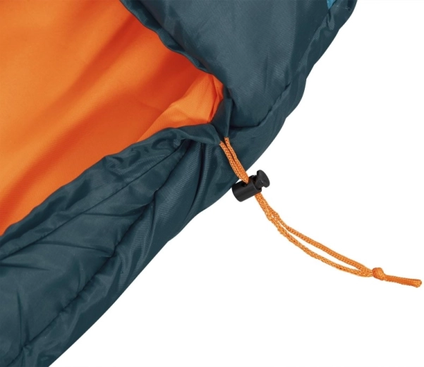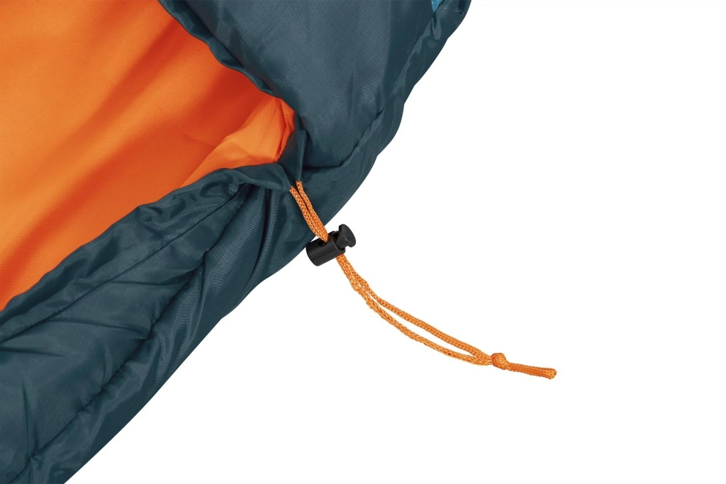 Fermoarul bidirecțional pe toată lungimea, cu clapetă izolatoare, și clapeta la umeri protejează împotriva curentului, iar gluga reglabilă menține căldura la nivelul capului în nopțile reci. Exteriorul rezistent din poliester reciclat 210T și interiorul fin pongee 190T oferă o senzație plăcută și respirabilitate bună. Datorită husei de compresie, sacul se împachetează ușor și economisește spațiu în rucsac (greutate totală aprox. 1,4 kg).