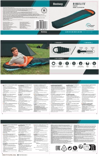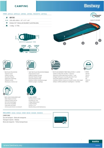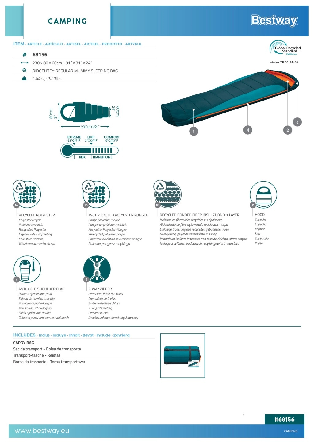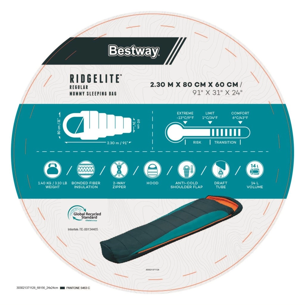 BESTWAY Ridgelite este un sac de dormit tip mumie care îmbină confortul termic, greutatea redusă și sustenabilitatea. Forma ergonomică 230 × 80/60 cm minimizează pierderile de căldură, în timp ce umplutura într-un singur strat din poliester reciclat 280 g/m² și materialele certificate GRS asigură o alegere responsabilă pentru natură și performanță fiabilă pe teren.