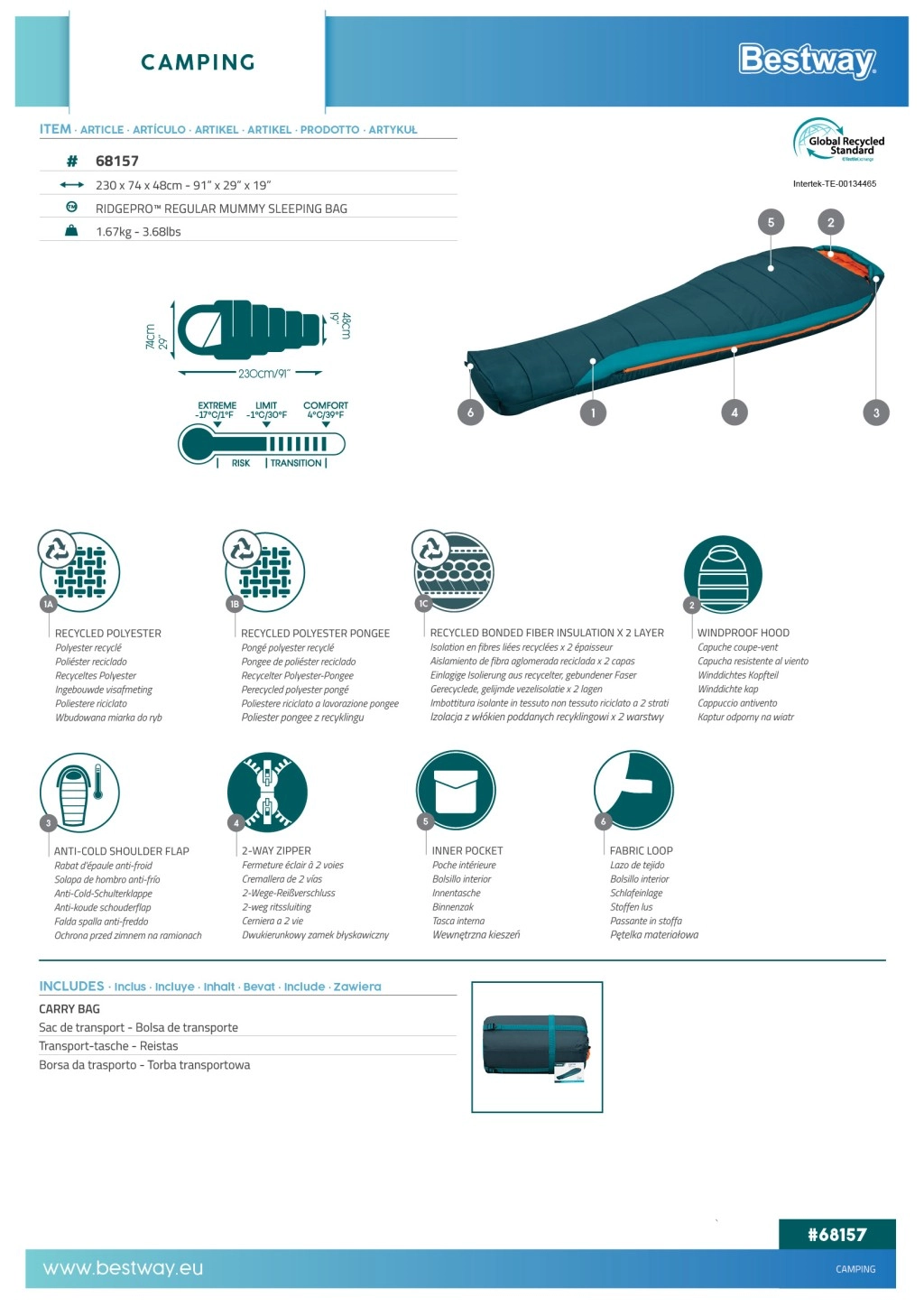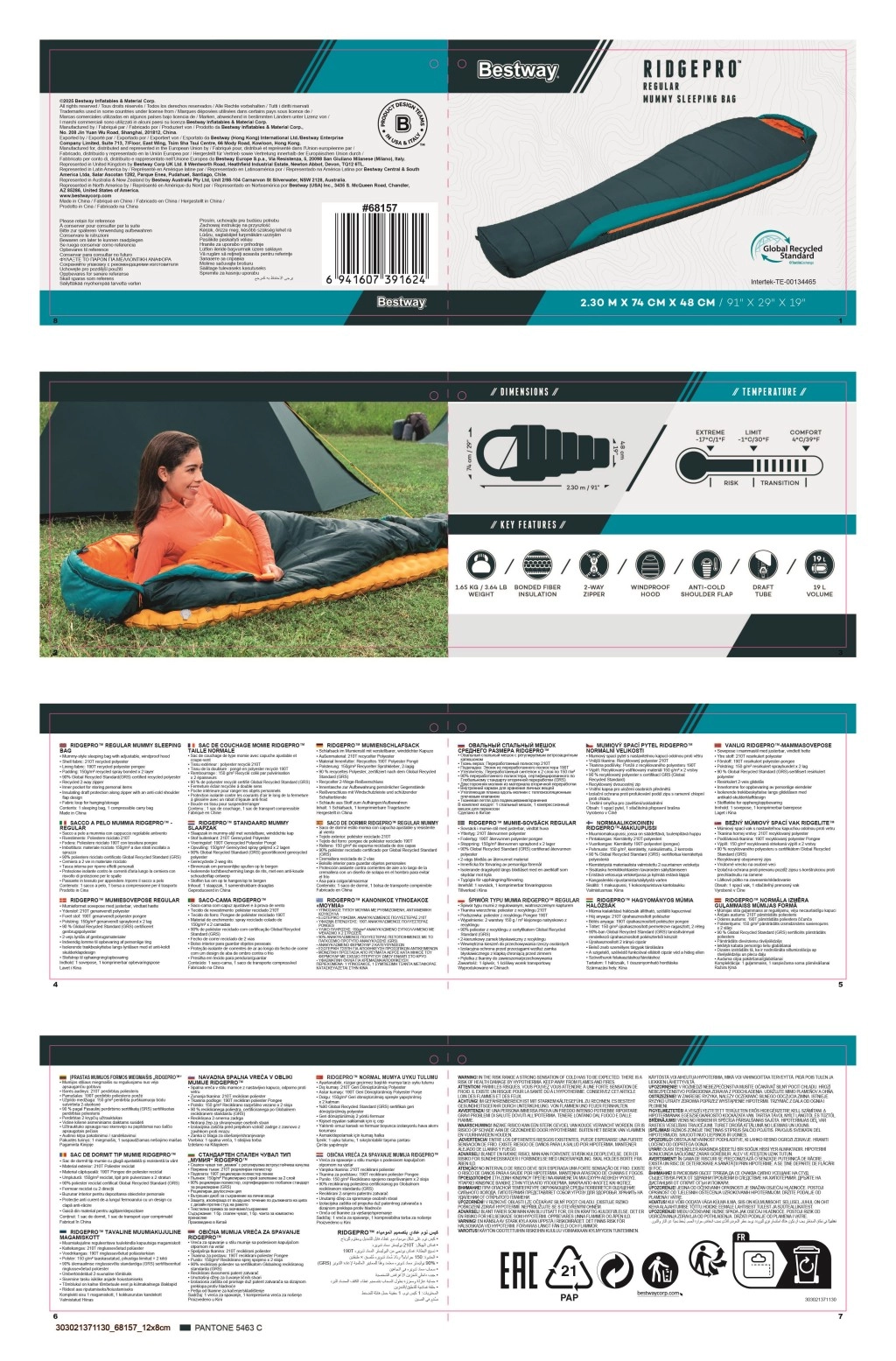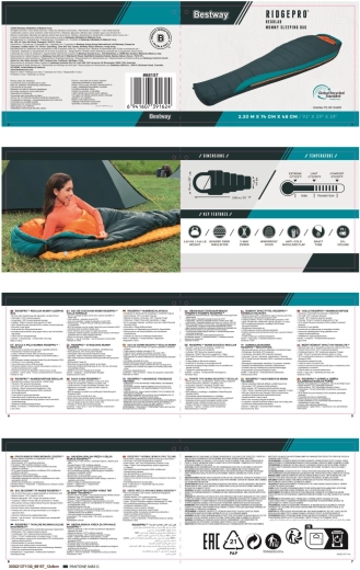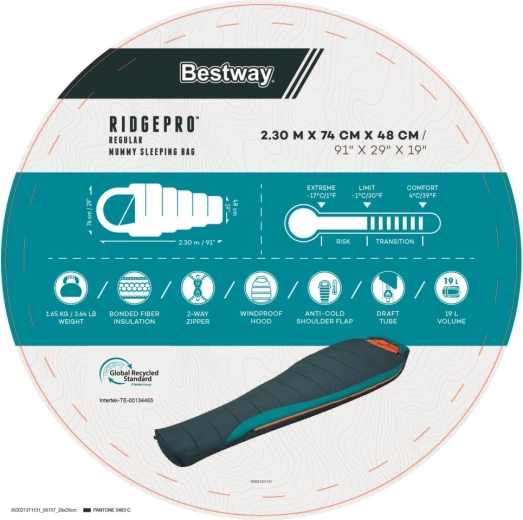 BESTWAY RidgePro este un sac de dormit tip mumie conceput pentru izolație termică fiabilă și confort din primăvară până în toamnă. Forma care îmbrățișează corpul minimizează pierderea de căldură, în timp ce materialele reciclate (poliester ripstop 210T la exterior și pongee 190T la interior) asigură durabilitate, senzație plăcută la atingere și amprentă ecologică redusă.