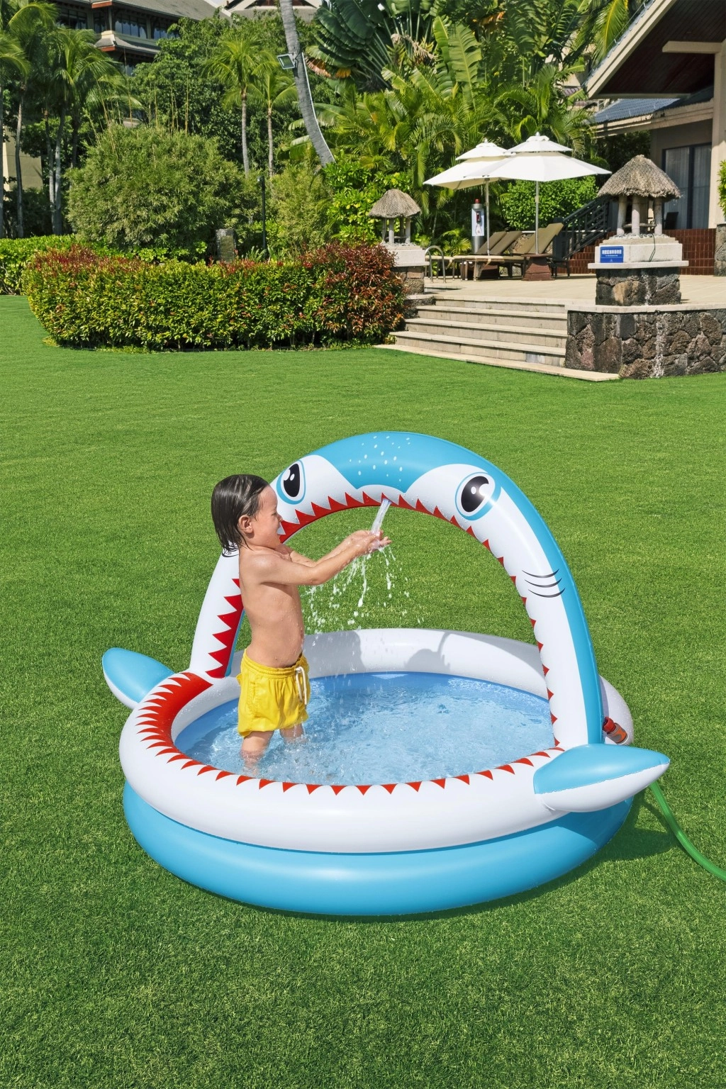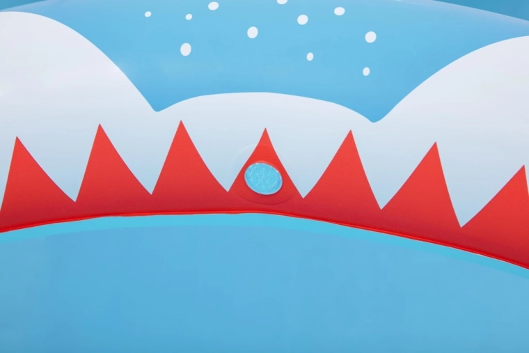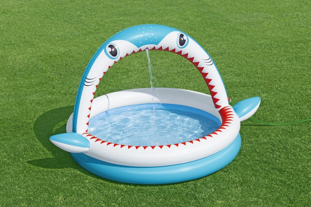 „Gura de rechin” arcuită pulverizează apă după conectarea furtunului de grădină și transformă piscina într-un loc de joacă acvatic plin de distracție.