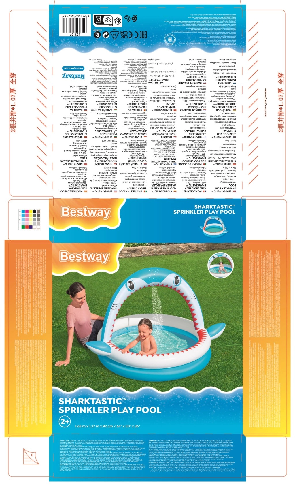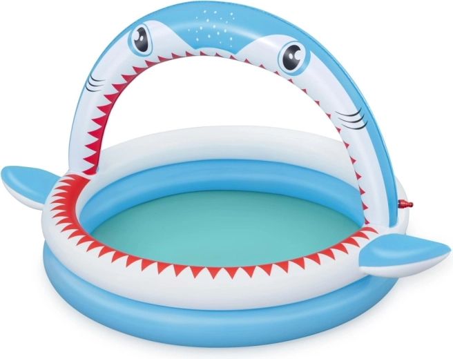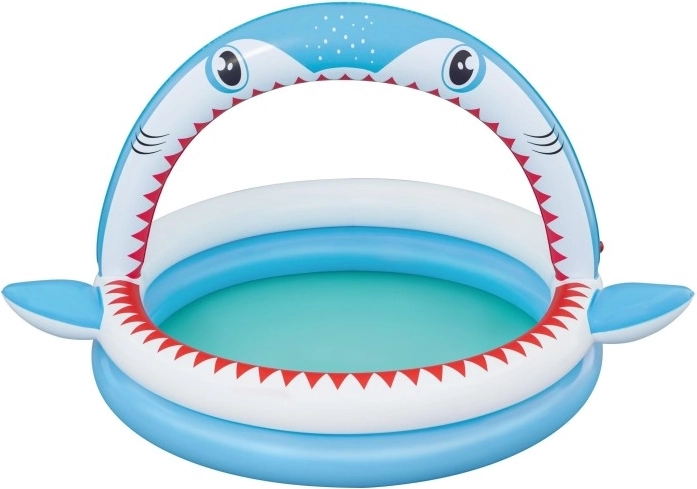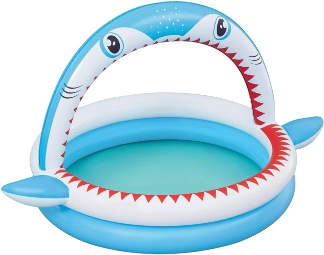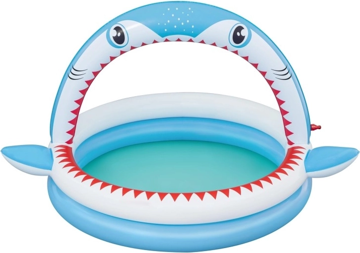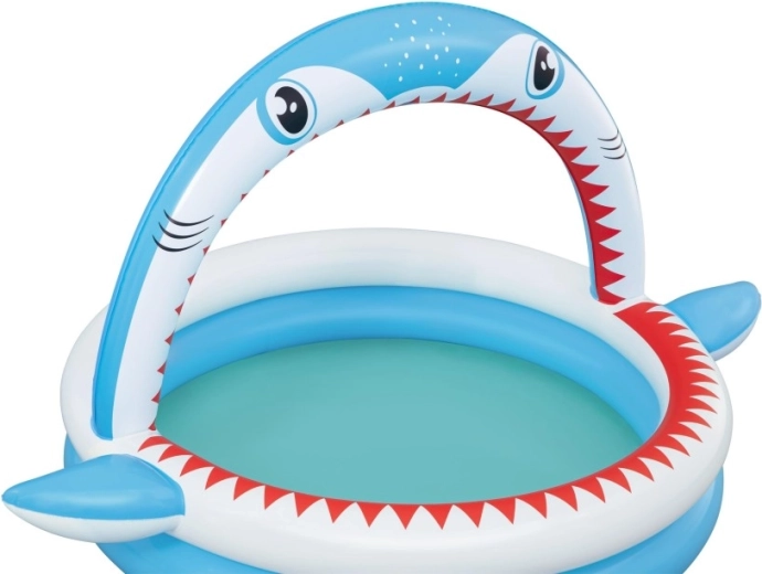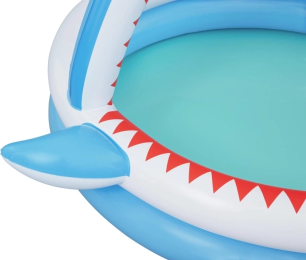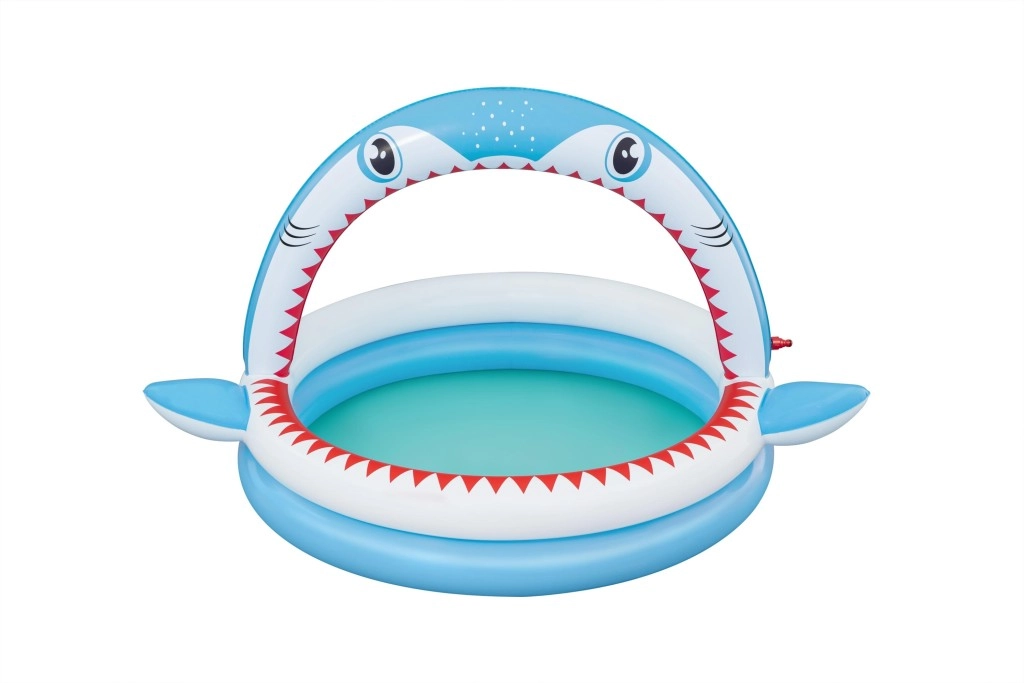 Piscină gonflabilă distractivă în formă de rechin cu duș integrat pentru răcorire în zilele caniculare. Oferă dimensiuni spațioase de 163 × 127 × 92 cm, pereți gonflabili moi și material PVC rezistent. Ideală pentru copii de la 2 ani, se umflă ușor, se conectează la furtunul de grădină și este gata în câteva clipe pentru joacă acvatică.