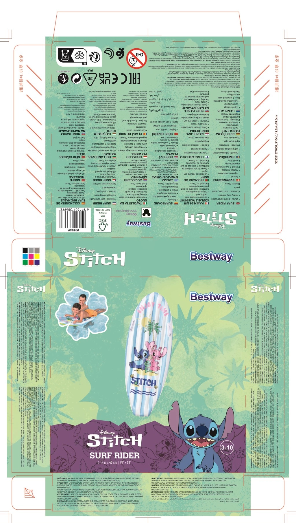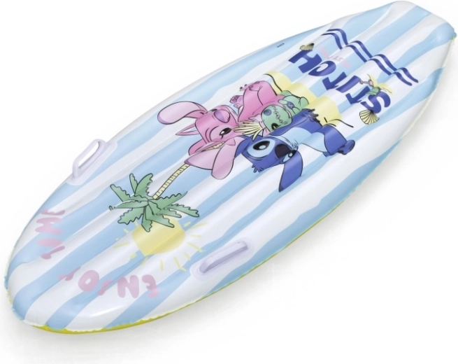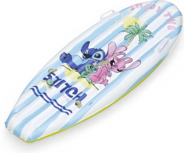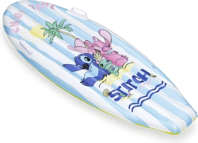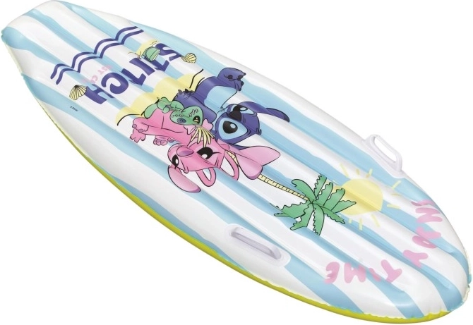Pluta de surf gonflabilă cu motiv DISNEY Stitch îi va încânta pe copii cu grafica veselă cu palmieri, soare și scoici. Dungile alb-albastre de pe partea superioară și fundul galben sporesc vizibilitatea pe apă, în timp ce greutatea redusă facilitează transportul și manipularea.