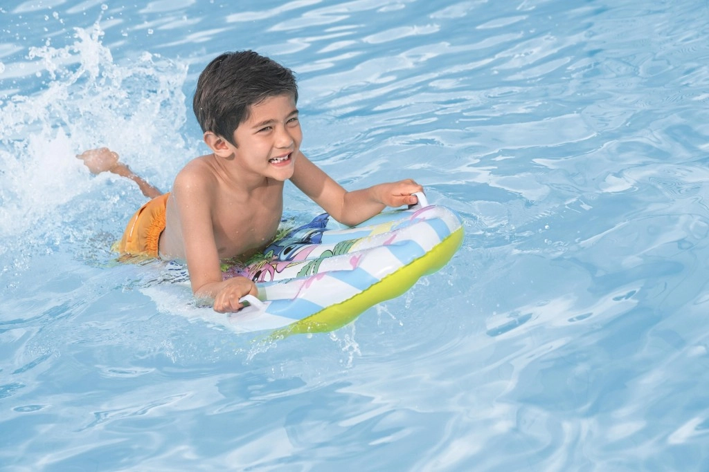 Pluta este proiectată pentru joacă confortabilă și sigură: două mânere laterale pentru o priză sigură, mai multe camere pentru stabilitate și supapă de calitate pentru umflare și dezumflare rapidă. Ideală pentru piscină, vacanță sau iaz – susține mișcarea, încrederea pe apă și distracția fără sfârșit.