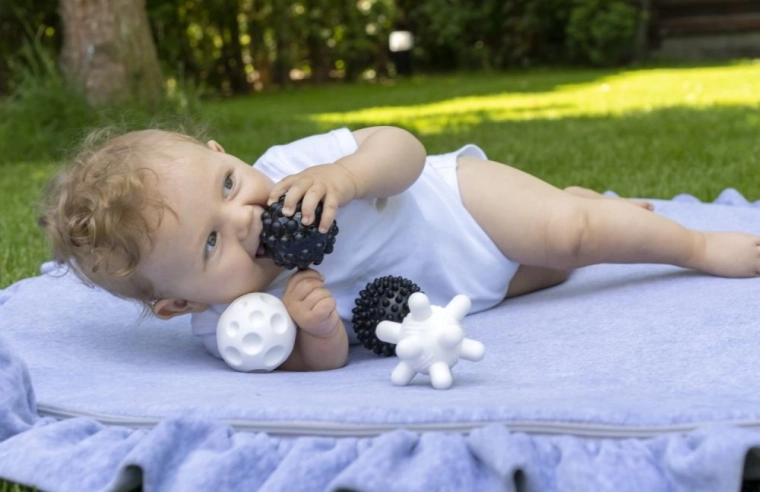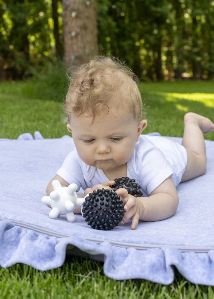 Ideal pentru masajul delicat al palmelor și tălpilor, pentru primele jocuri pe covoraș și ca accesoriu în coșul cu materiale Montessori. Datorită construcției ușoare și moi, mingile sunt potrivite pentru joaca zilnică acasă și în călătorii.