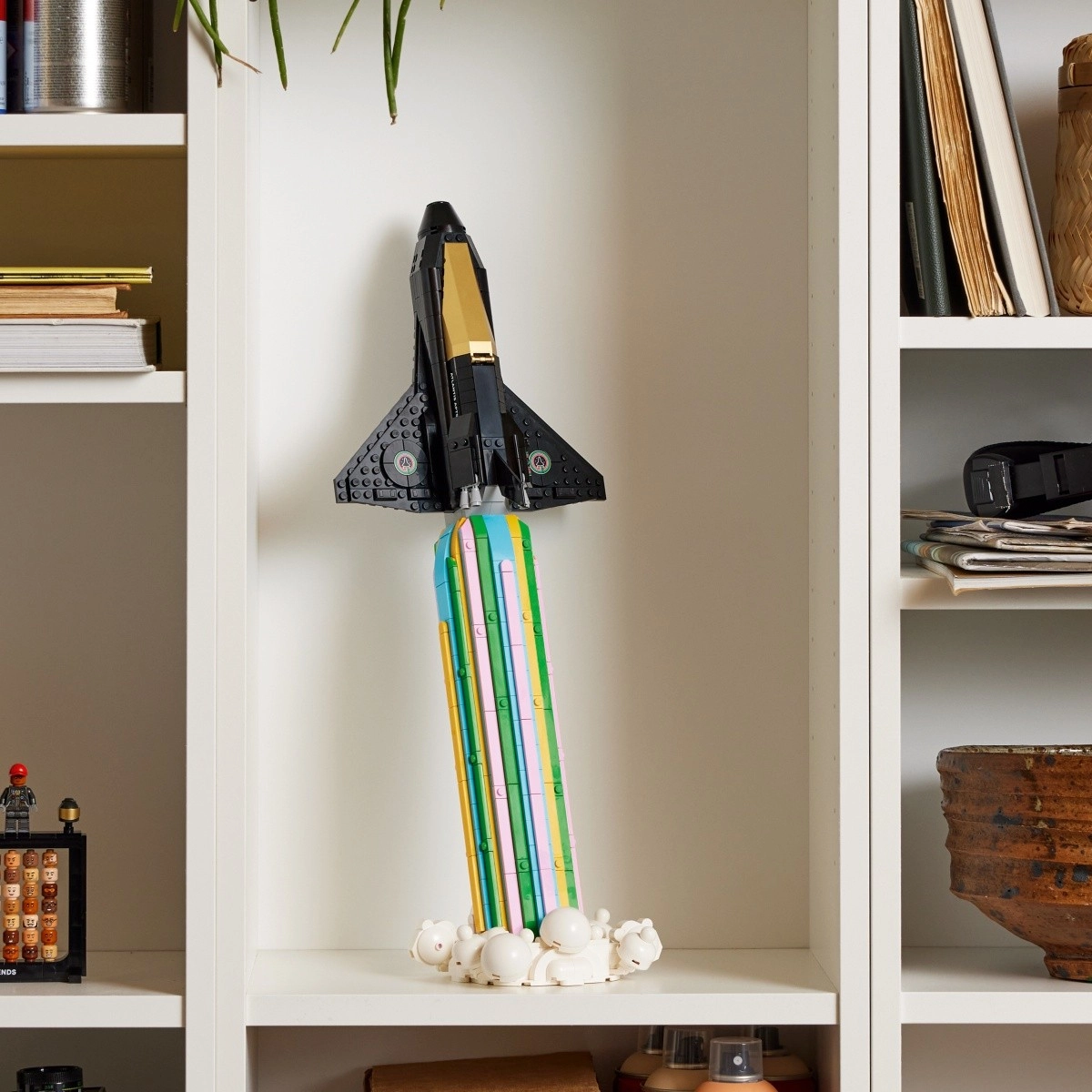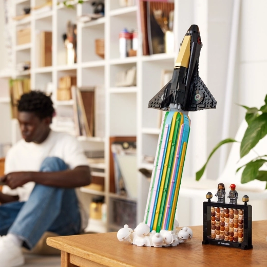 Detaliile ingenioase vor încânta orice constructor: cockpit care se deschide, tren de aterizare detașabil și două căști spațiale cu viziere aurii. Naveta poate fi expusă cu ușurință într-o poziție dinamică de lansare datorită bazei solide cu efect de tracțiune al motoarelor – o decorațiune perfectă pentru raft sau birou.