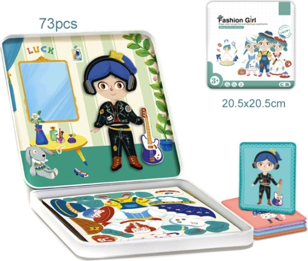 Această setare stilată oferă copiilor nenumărate variante de îmbrăcare și combinare. Cu ajutorul celor 62 de piese își pot crea propriile ținute, se pot inspira din cardurile-model și, cu markerul lavabil inclus, pot finisa accesoriile sau detaliile hainelor. Cutia metalică rezistentă este practică pentru depozitare și transport, astfel încât puzzle-ul este potrivit acasă, în excursii și în vacanțe.