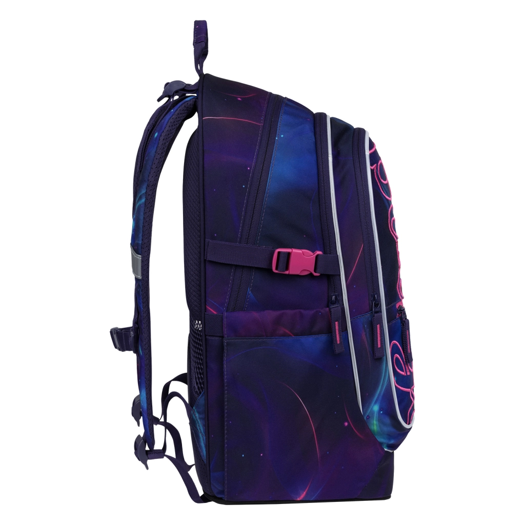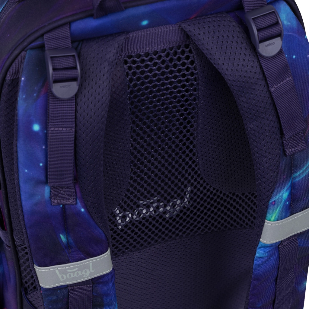 Panoul posterior anatomic cu ventilație, bretelele căptușite și reglabile și cureaua de piept asigură distribuția sănătoasă a greutății pe tot parcursul zilei de școală.