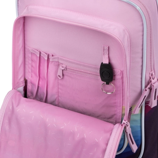 Spate căptușit, bretele de umăr și curea toracică reglabile, trei compartimente cu organizator și buzunar pentru laptop de 15". Elemente reflectorizante și material impermeabil pentru un drum sigur la școală.