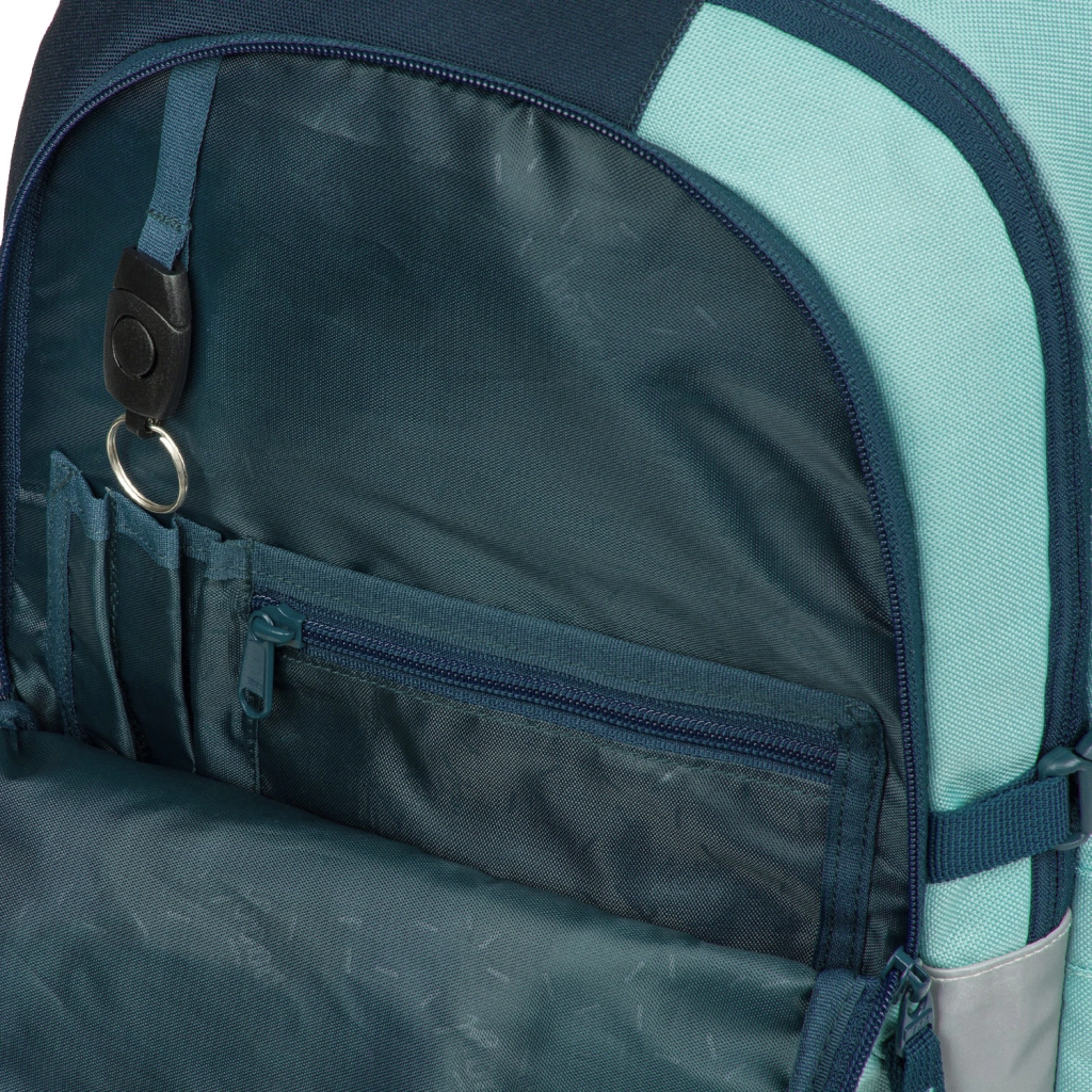 Compartiment principal încăpător cu dublă clapetă rabatabilă, buzunar interior și fereastră pentru orar. Materiale durabile din surse reciclate și fermoare YKK de încredere. Penarul este livrat fără conținut.
