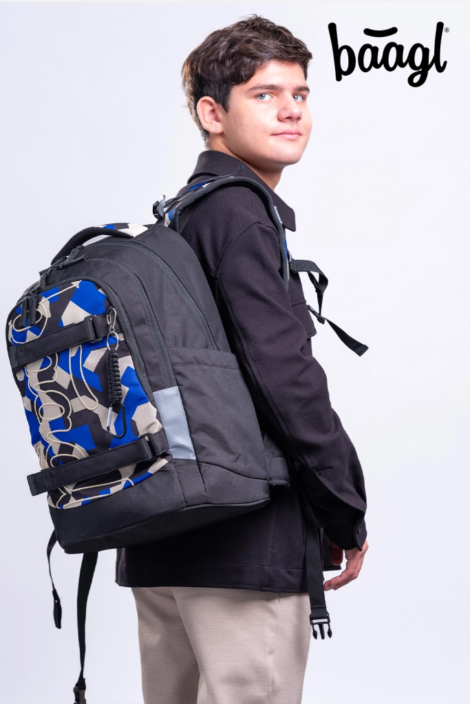 La interior găsiți un organizator cu trei compartimente cu buzunare bine structurate, buzunar catifelat pentru laptop împotriva zgârieturilor, buzunar din plasă cu fermoar și clips pentru chei. Buzunarele laterale din material rezistent sunt ideale pentru sticla BAAGL, iar fermoarele duble YKK permit acces rapid. Mânerele întărite cresc capacitatea de transport până la 8 kg, iar brelocul stilat completează designul.