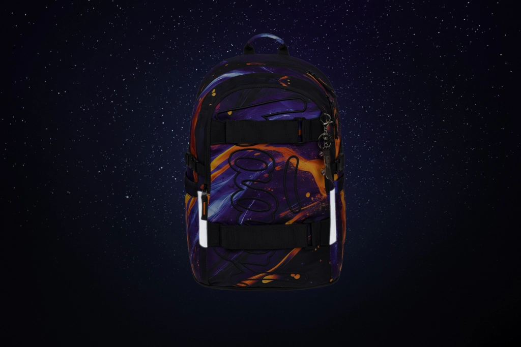 Spate cu formă anatomică și întăritură lombară, chingi de compresie și trei compartimente pentru organizare clară. Include buzunar capitonat pentru laptop de 15" și buzunare laterale pentru sticlă. Chingi pentru fixarea skateboardului și detalii reflectorizante pentru siguranță sporită.