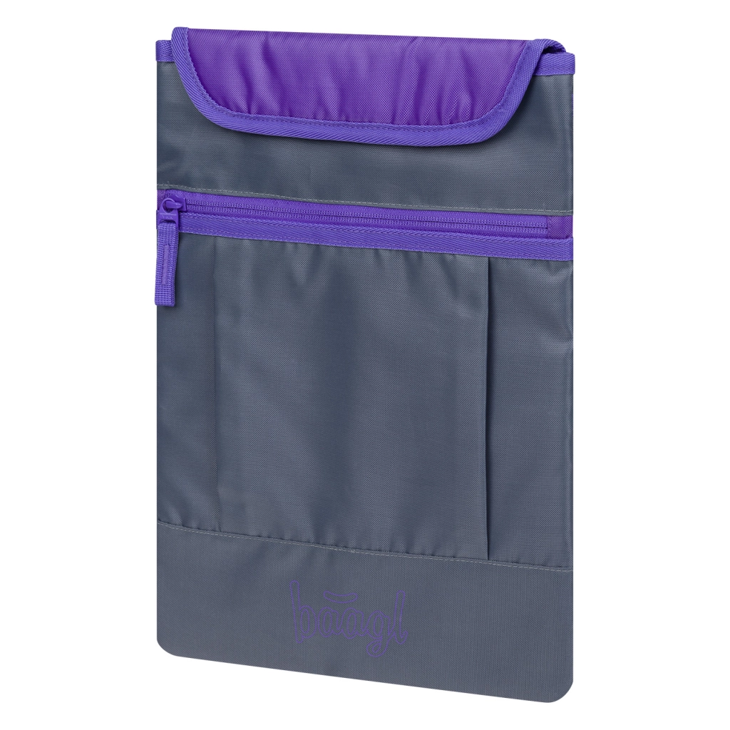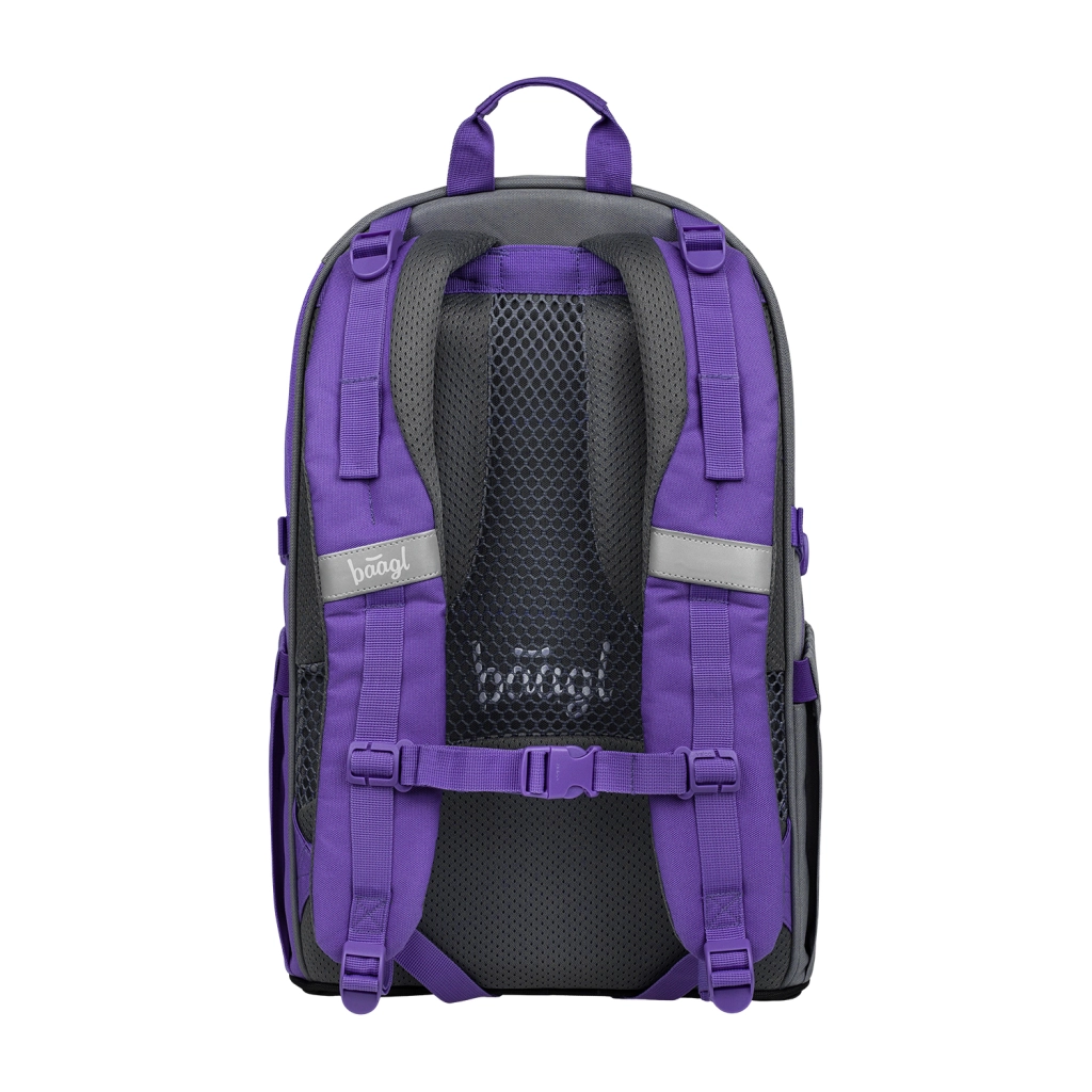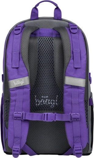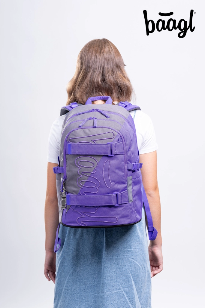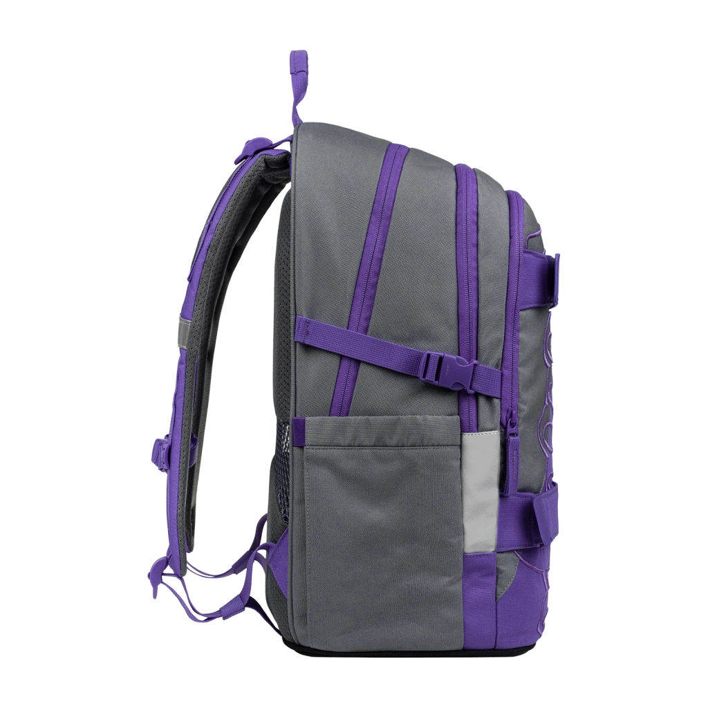 Echipare școlară completă în designul unitar DUAL: rucsac ergonomic cu trei compartimente și organizator, geantă sport pliabilă pentru antrenamente sau excursii de weekend, borsetă pentru purtarea în siguranță a obiectelor mici și penar dublu cu organizare clară. Întregul set este asortat în tonuri moderne violet-gri și este fabricat din materiale reciclate, hidrofobe cu accent pe durabilitate îndelungată.