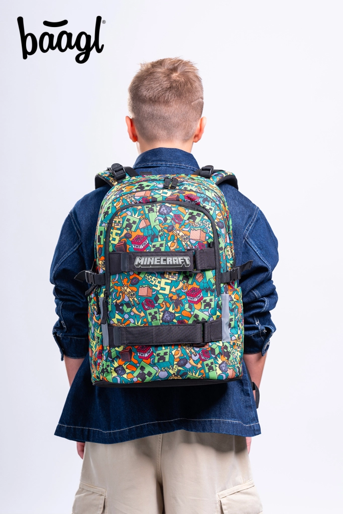 Set școlar stilat pentru fanii MINECRAFT include un rucsac ușor Skate, un penar încăpător, un săculeț practic pentru încălțăminte, o borsetă confortabilă și o husă universală. Setul oferă design ergonomic, elemente reflectorizante pentru siguranță, fermoare YKK de calitate și materiale reciclate rezistente potrivite pentru utilizare zilnică.