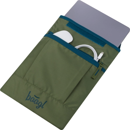 Husă BAAGL stilată și rezistentă pentru laptopuri de până la 15" oferă protecție fiabilă atât în rucsac, cât și purtată separat. Este fabricată din 100% material reciclat cu certificare GRS, are suprafață impermeabilă, căptușeală moale și buzunar frontal pentru accesorii cu fermoar YKK pentru durabilitate îndelungată.