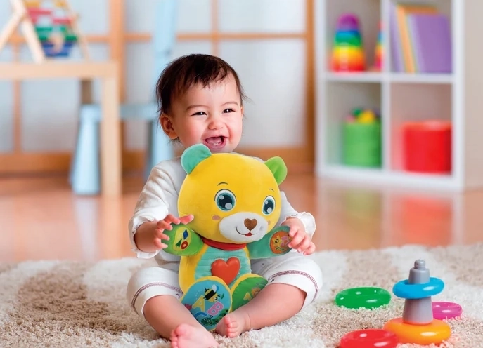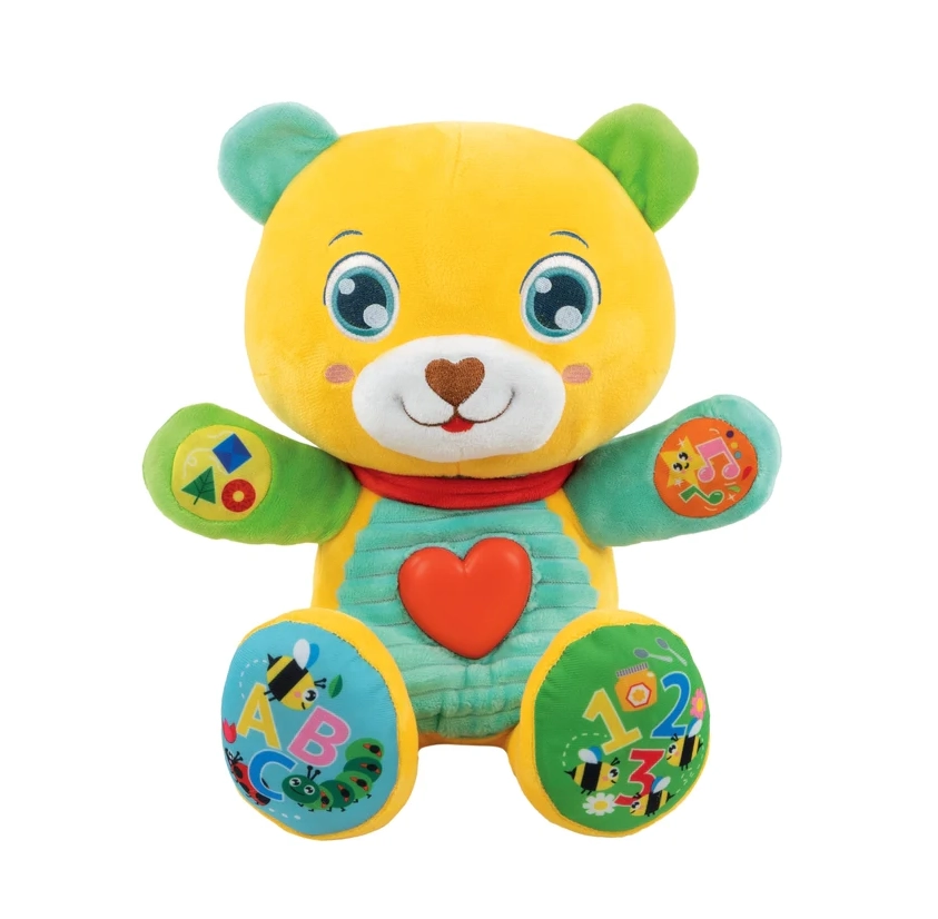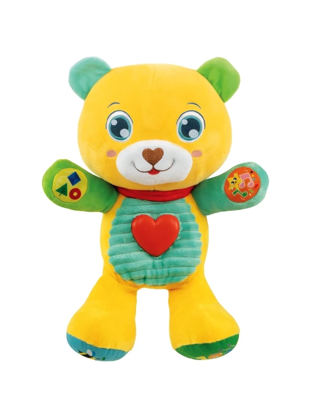 Cu ajutorul celor 5 butoane tactile, copilul învață să recunoască literele, numerele, culorile și formele. Inimioara strălucitoare se aprinde când ursulețul vorbește sau cântă cântecele și poezioare vesele, susținând stimularea senzorială, ritmul și motricitatea fină.