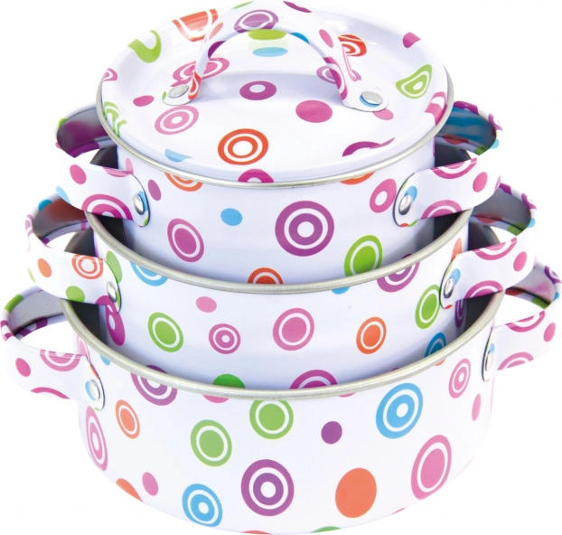 Set stilat de vase din metal pentru micii bucătari și bucătărese aduce un joc realist de gătit acasă și în aer liber. Conține 3 oale cu capace, tigaie, polonic, strecurătoare, paletă și mănușă de bucătărie. Construcția durabilă, designul vesel cu buline și 11 piese practice stimulează imaginația și dezvoltă motricitatea fină.