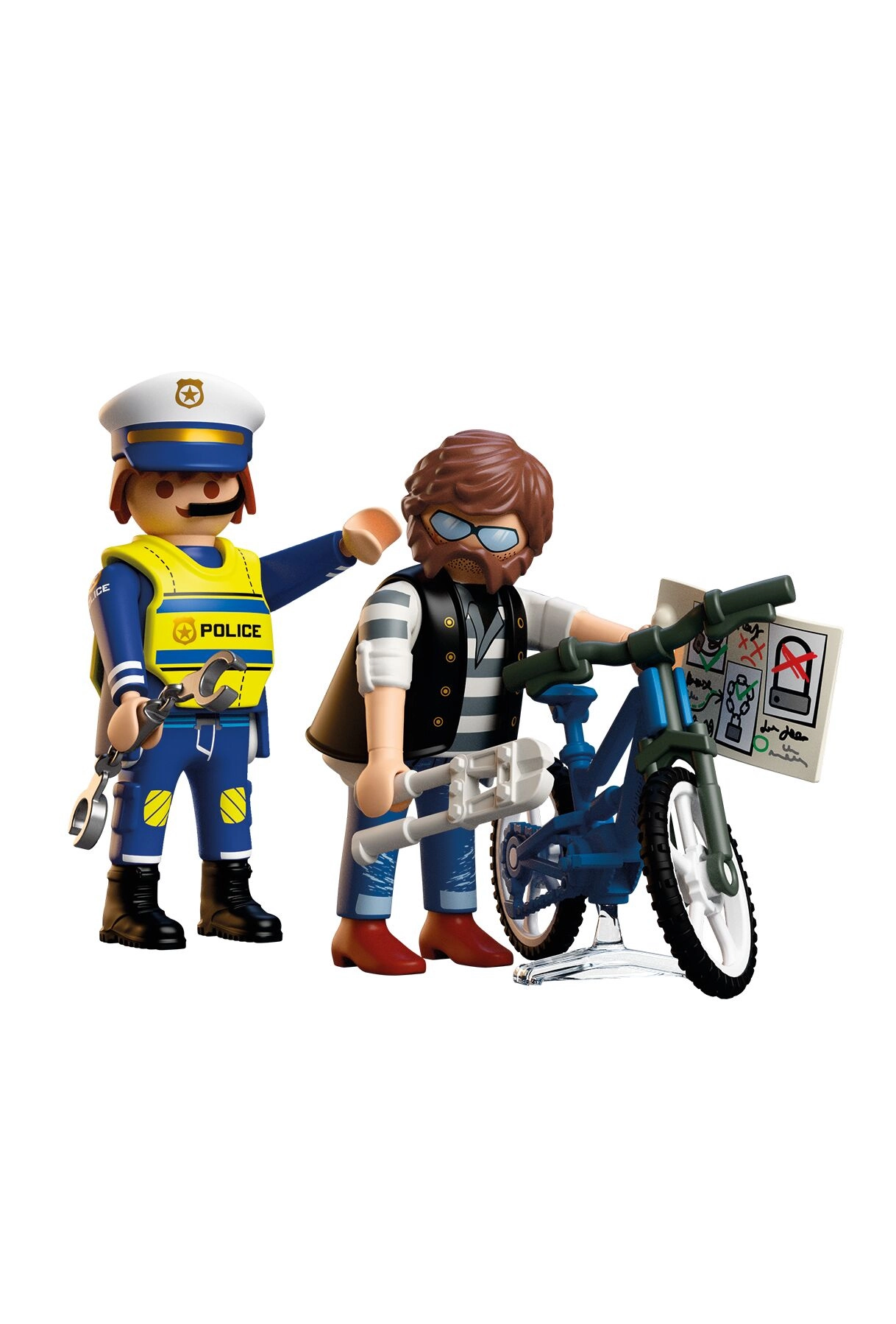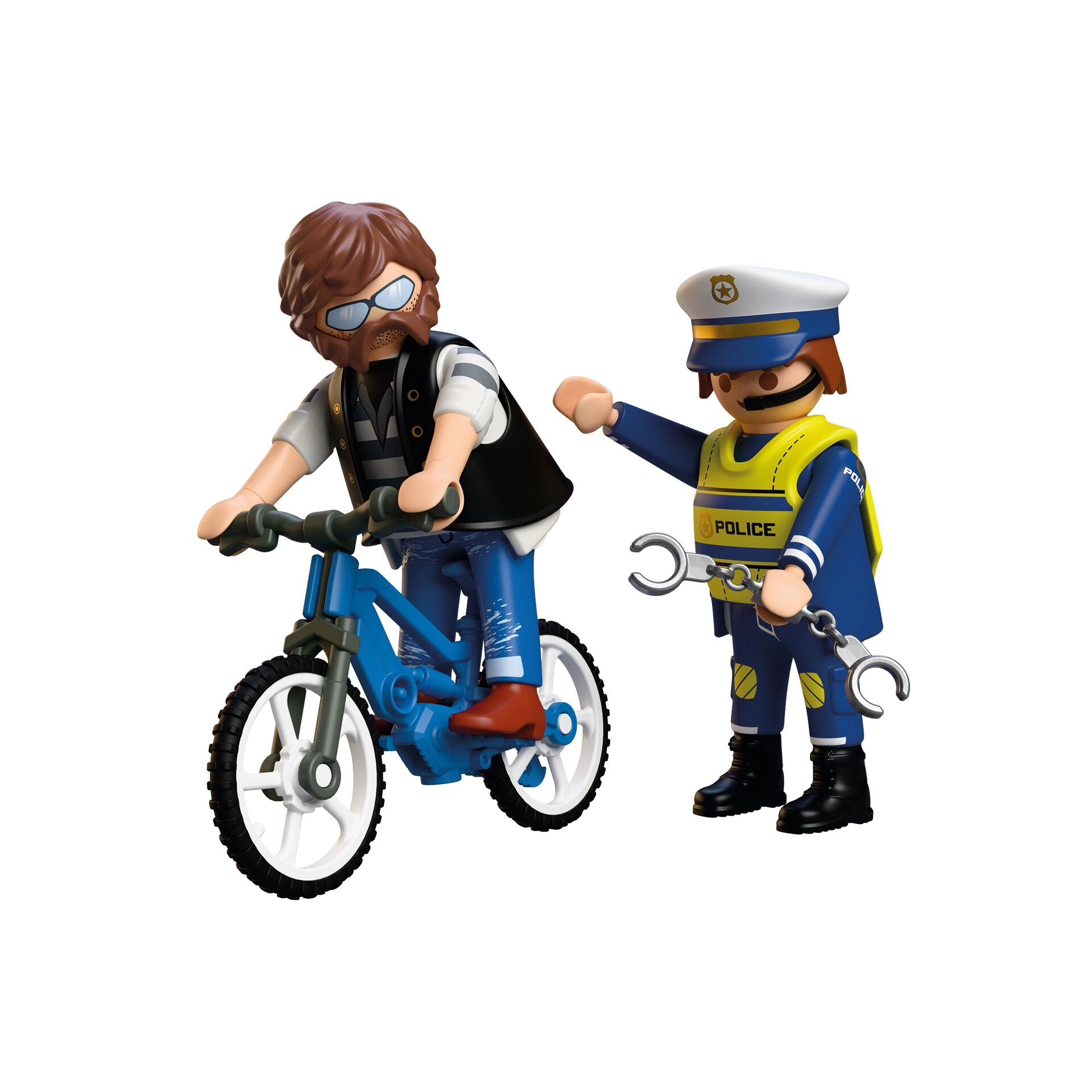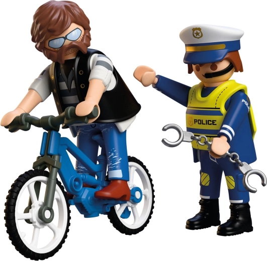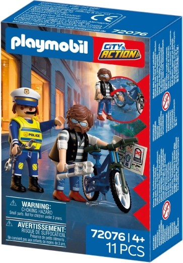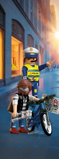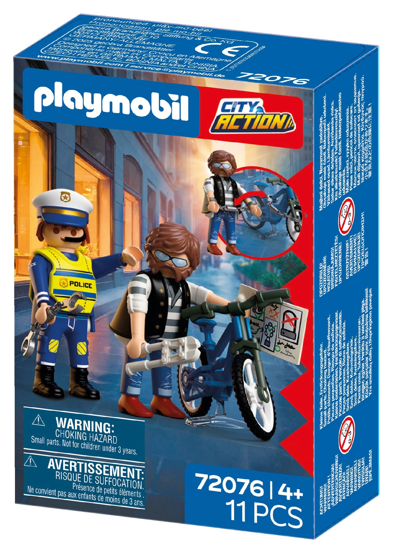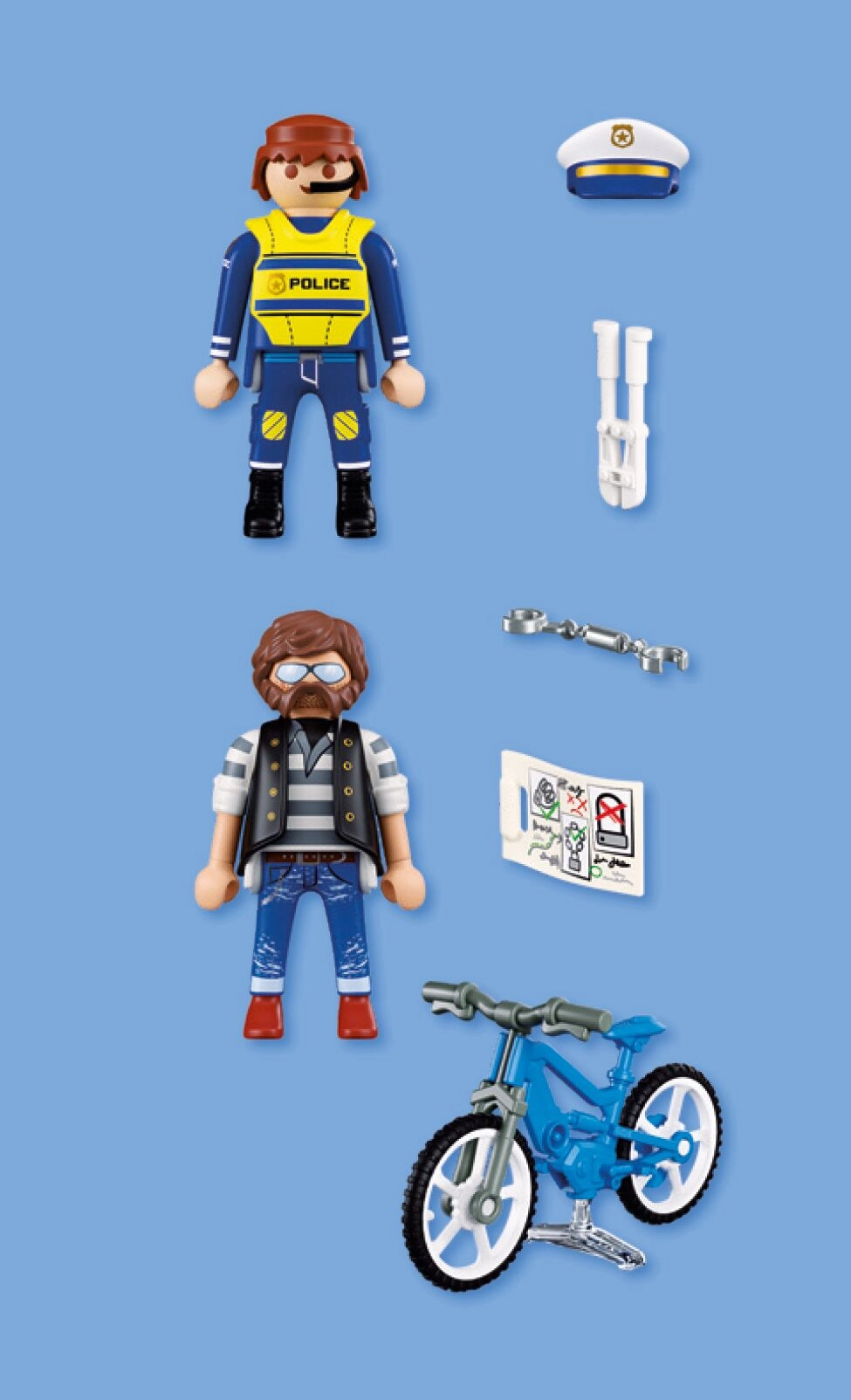 Setul Playmobil City Action – Furt de bicicletă aduce suspans direct în camera copilului. Două figurine detaliate – polițist și infractor – și numeroase accesorii le permit copiilor să-și creeze propriile povești pline de urmăriri, rețineri și manevre ingenioase. Ideal atât ca joc de sine stătător, cât și ca extindere pentru alte seturi PLAYMOBIL.