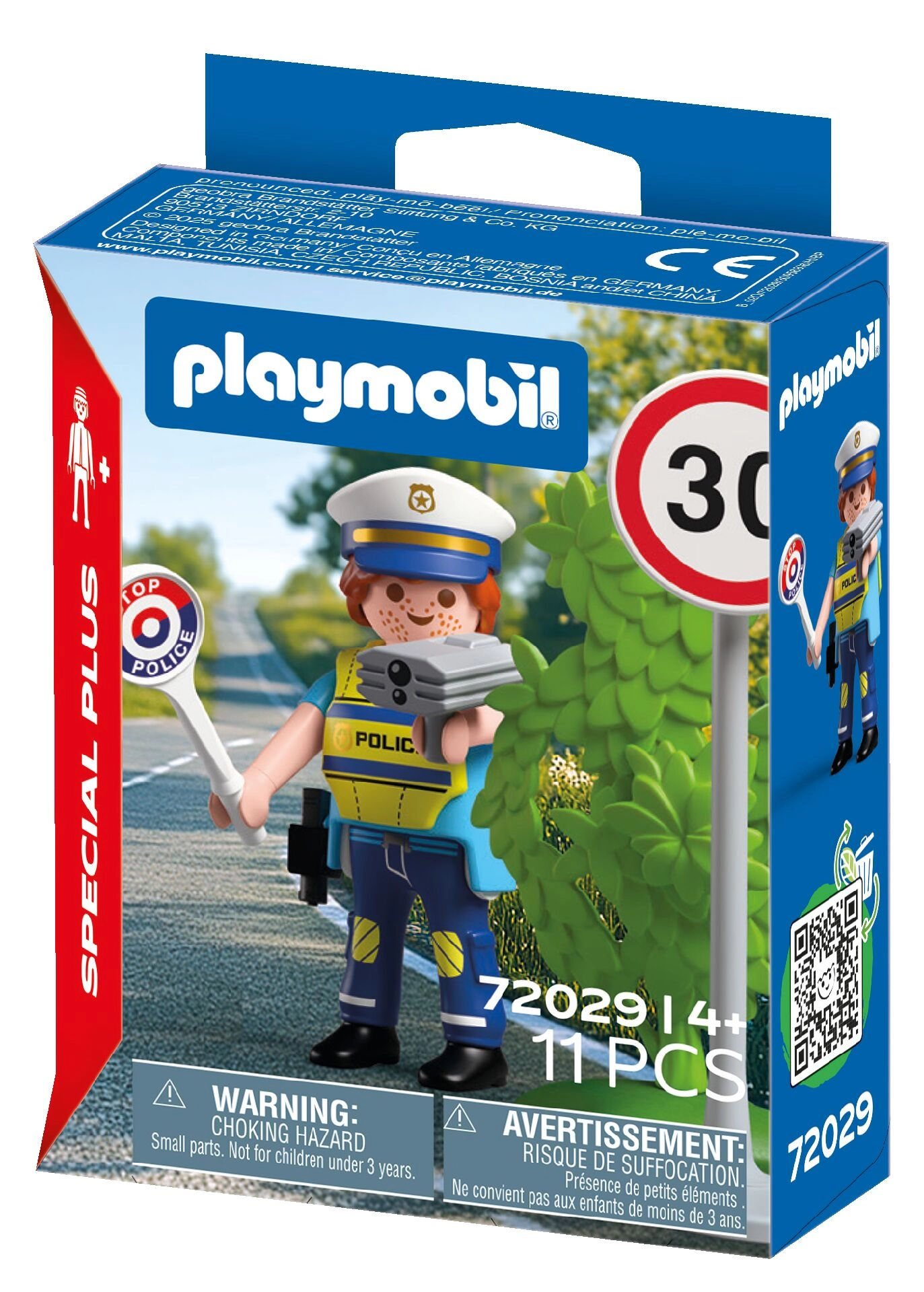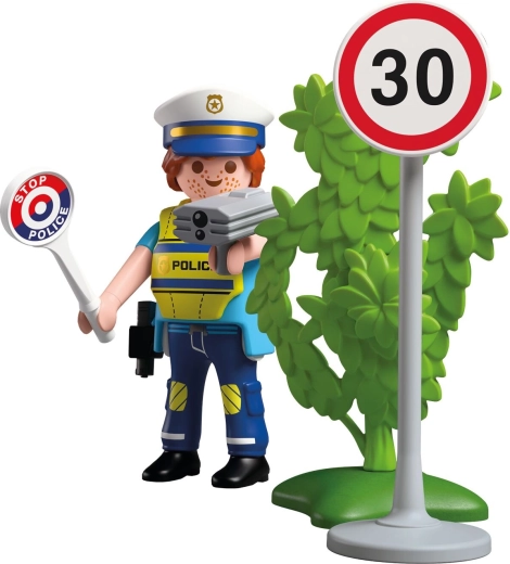 Include indicator 30 km/h, cameră radar, șapcă de polițist, cătușe, pistol cu toc și un tufiș verde – pentru scene și mai variate.
