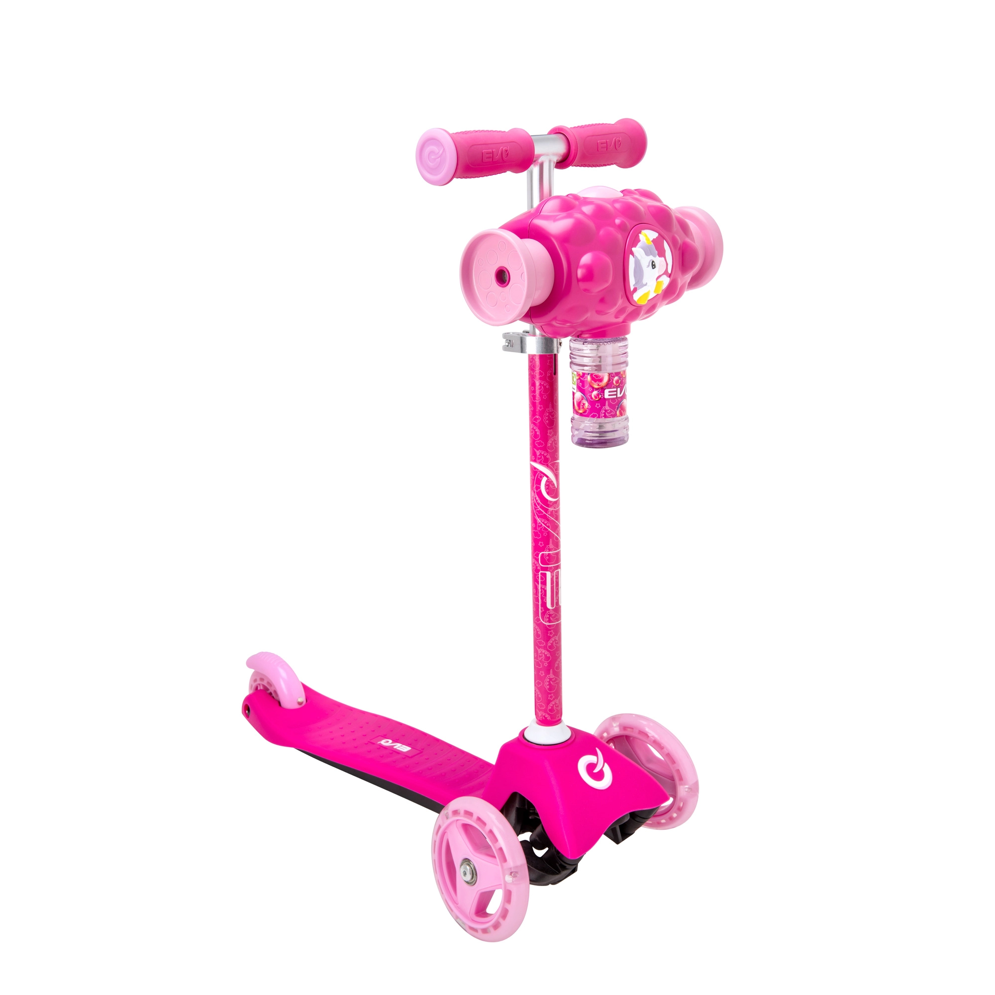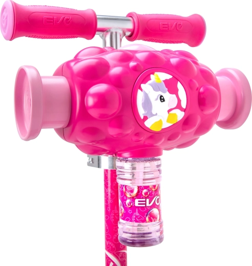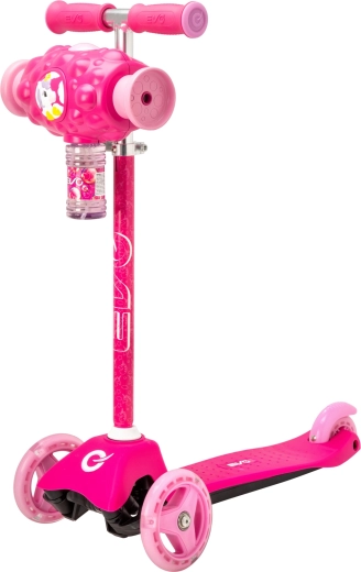 Trotinetă pentru copii EVO Bubblz Mini Cruiser, distractivă și stabilă, cu trei roți, direcție prin înclinare și ghidon reglabil. Generatorul de bule integrat creează o mulțime de bule în timpul mersului, ceea ce îi încântă pe cei mici. Platforma lată cu suprafață antiderapantă, frâna de picior spate și rulmenții ABEC-5 asigură o deplasare confortabilă și silențioasă. Ideală pentru copii de la 3 ani și pentru dezvoltarea echilibrului și coordonării.