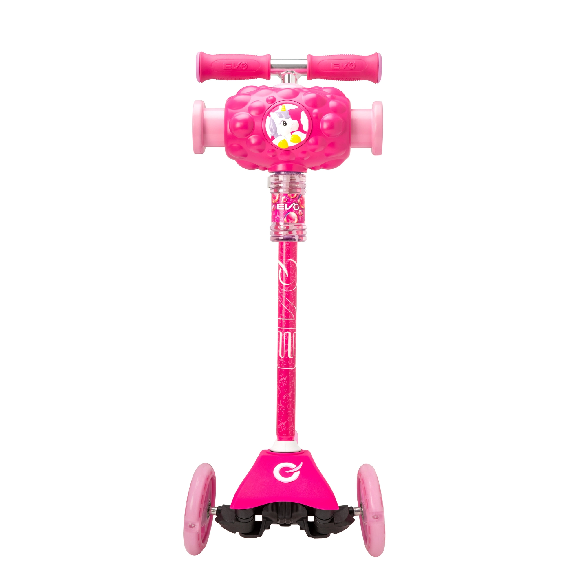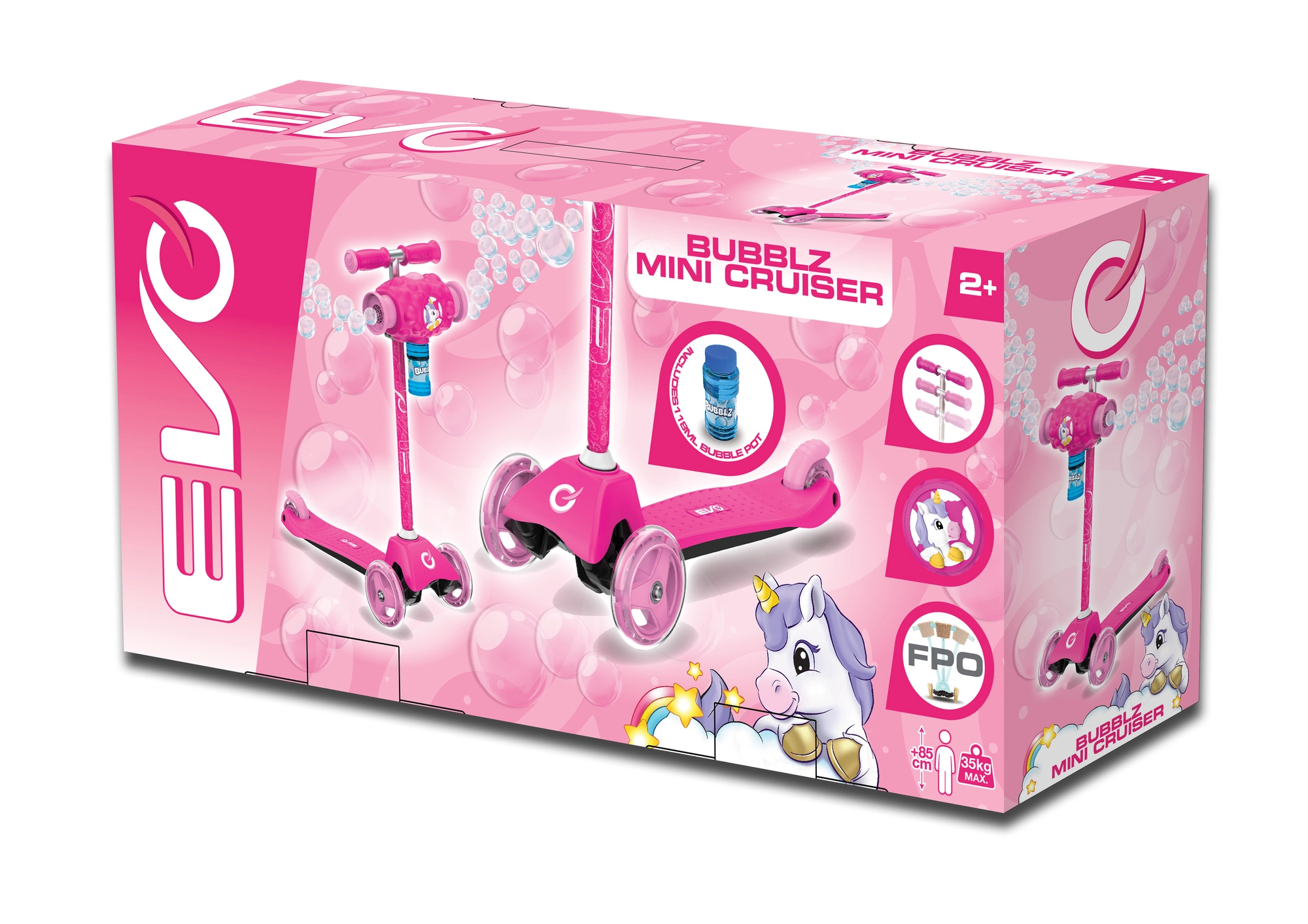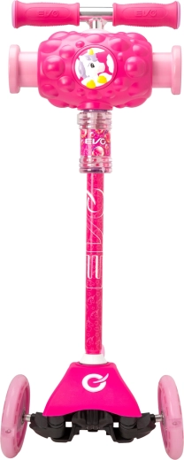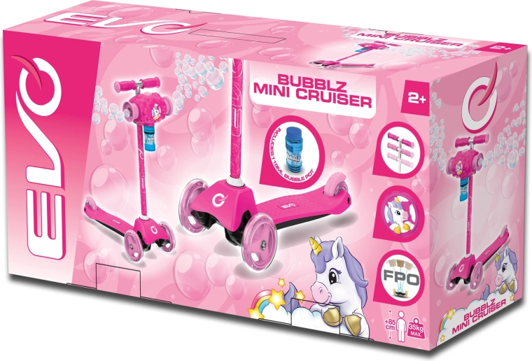 EVO Bubblz Mini Cruiser este o trotinetă cu trei roți, jucăușă și sigură, pentru micii rideri. Datorită celor două roți din față și uneia din spate oferă o stabilitate excelentă, iar direcția prin înclinare îi ajută pe copii să își antreneze natural echilibrul și coordonarea. Înălțimea reglabilă a ghidonului permite adaptarea trotinetei la statura copilului, astfel încât “crește” împreună cu el.