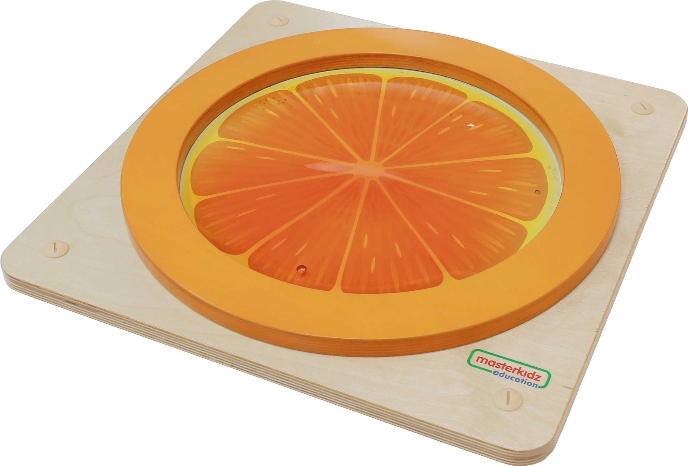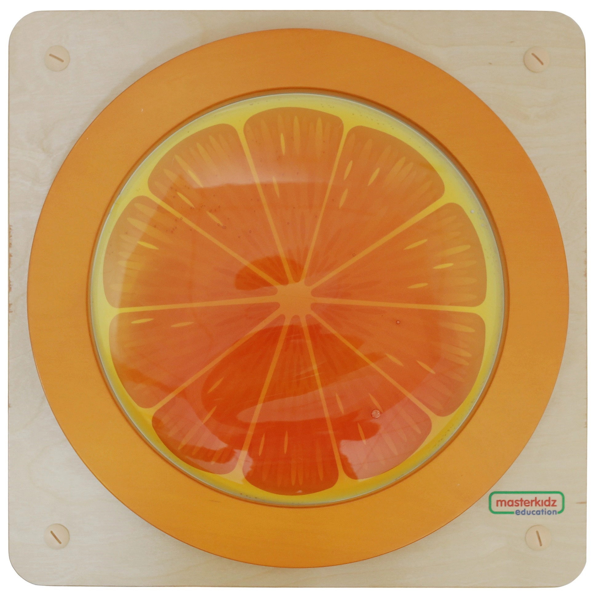 Descoperă panoul senzorial jucăuș Masterkidz în formă de portocală, care susține explorarea tactilă, motricitatea fină și concentrarea. Copiii pot apăsa cupola transparentă cu gel portocaliu, pot urmări mișcarea lină a lichidului și se pot liniști în timpul jocului concentrat. Baza robustă din lemn și opțiunea de montaj pe perete asigură utilizare sigură și stabilă acasă, la grădiniță și în sălile de joacă.