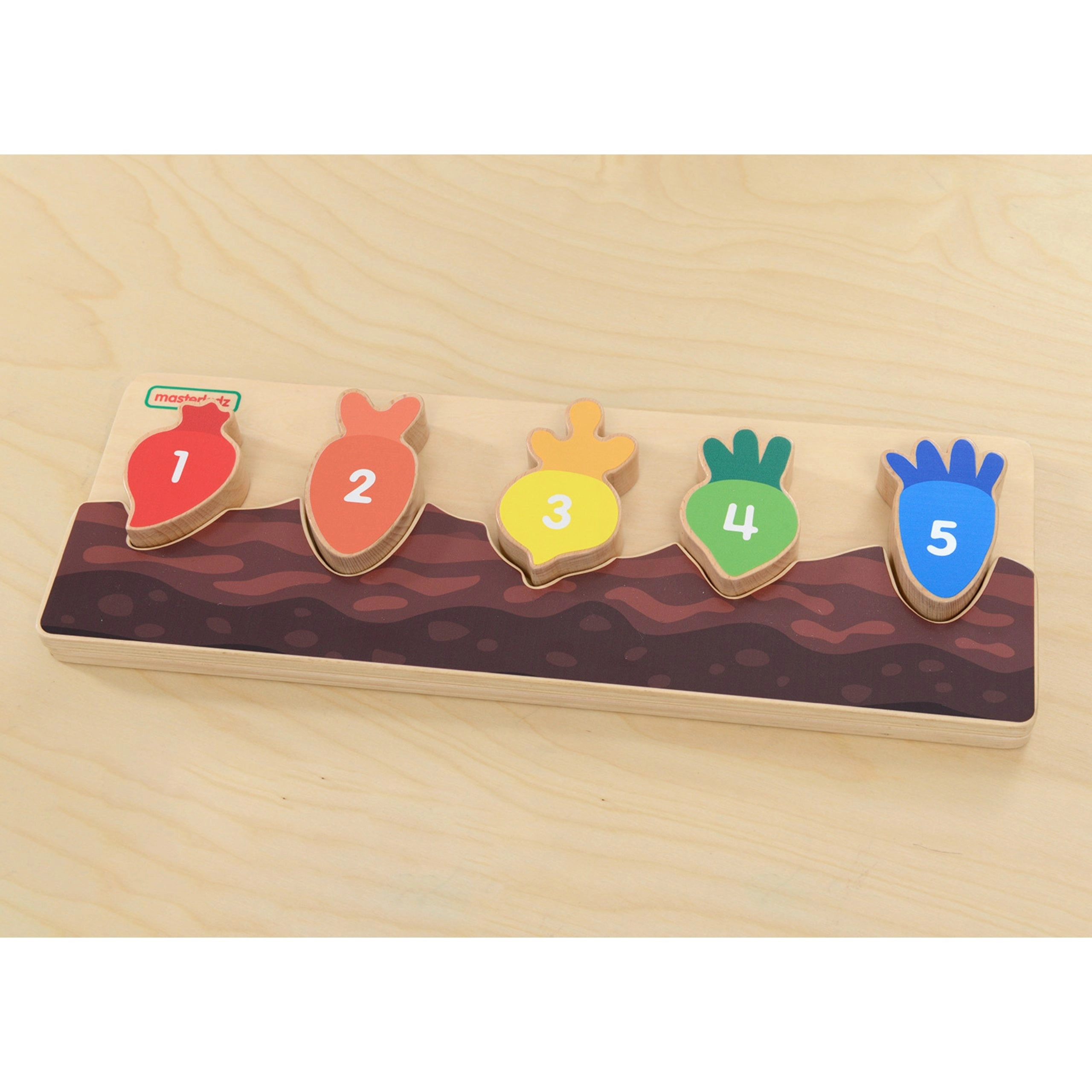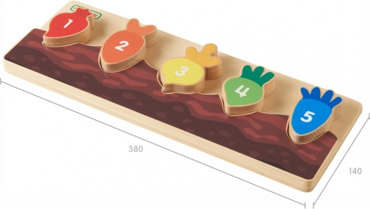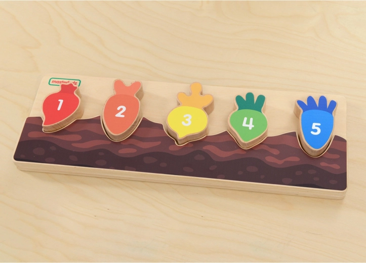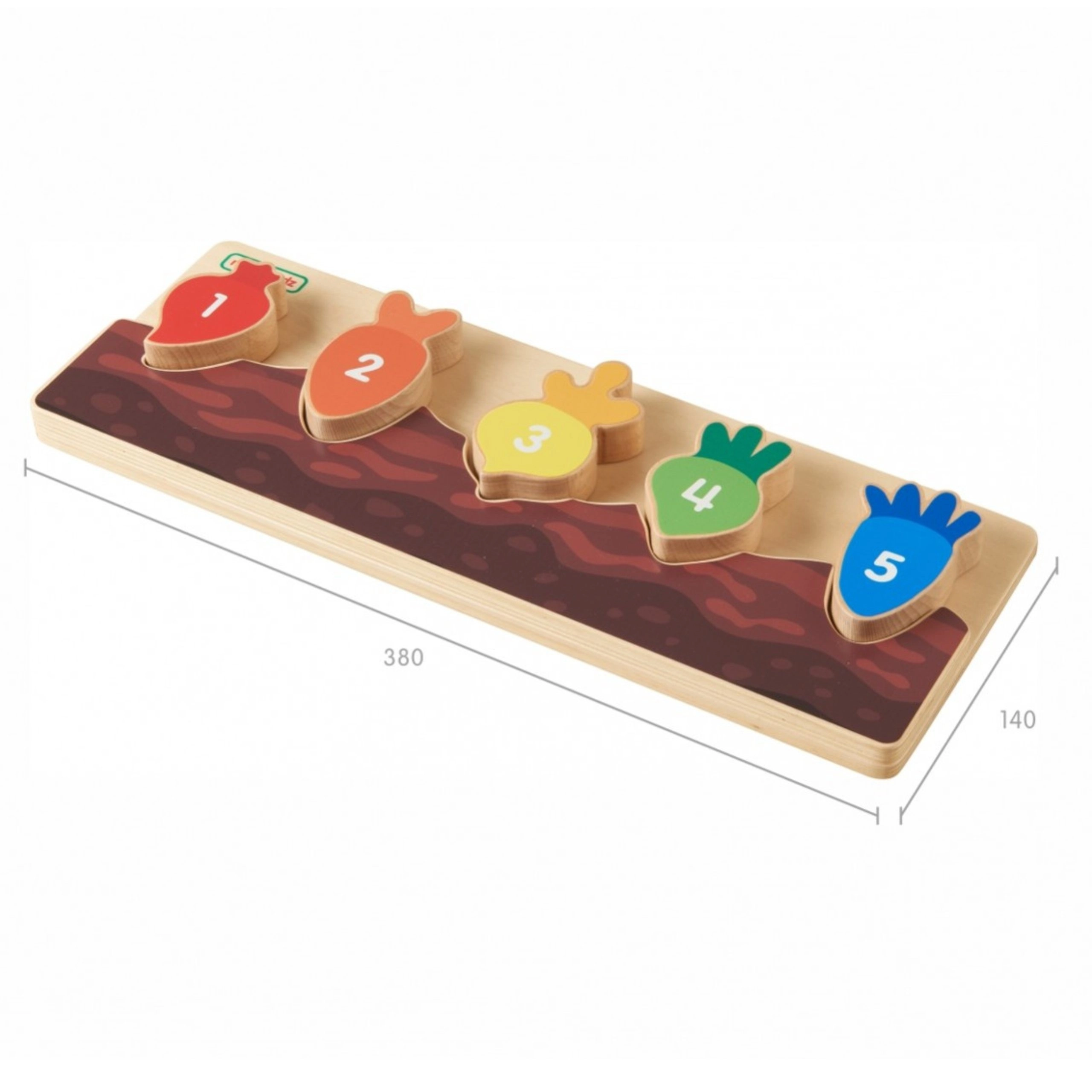 Fiecare piesă de legumă colorată este marcată cu un număr și se potrivește doar în propriul decupaj. Copiii exersează natural numărarea și secvența 1–5.