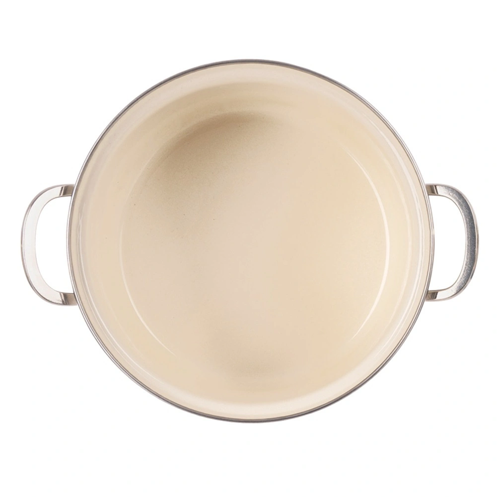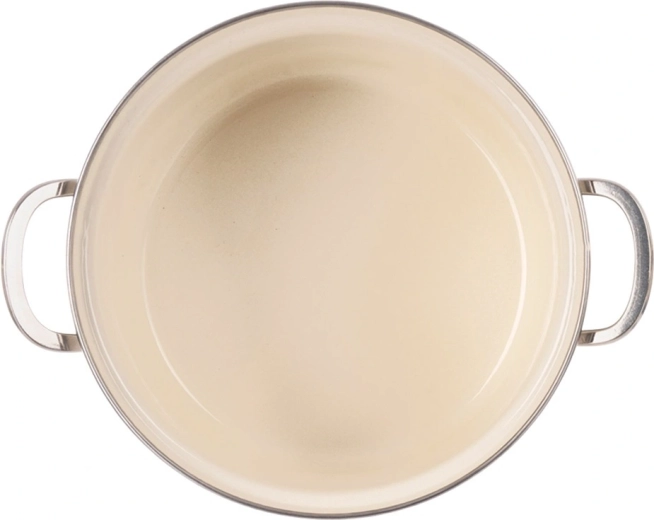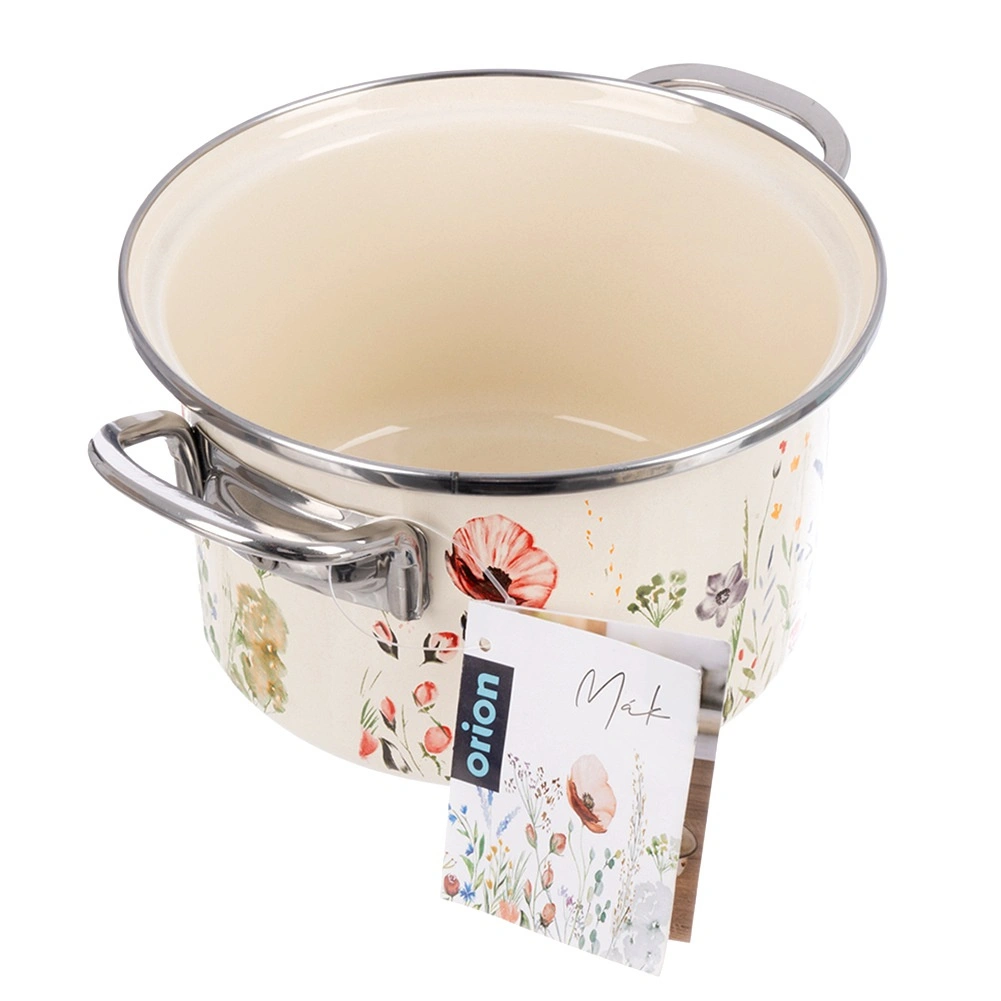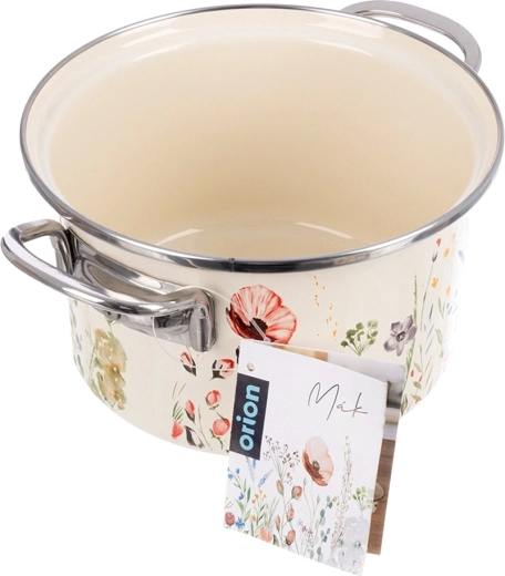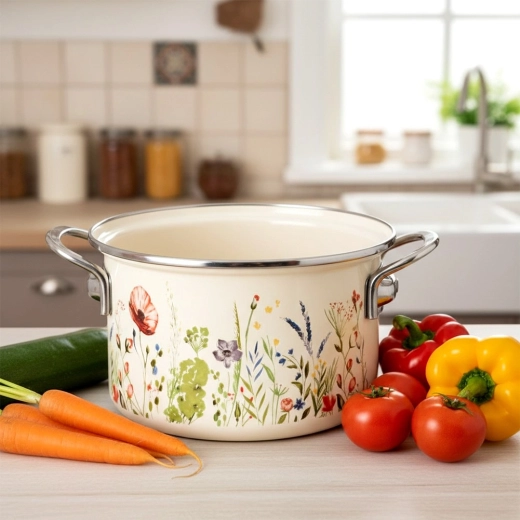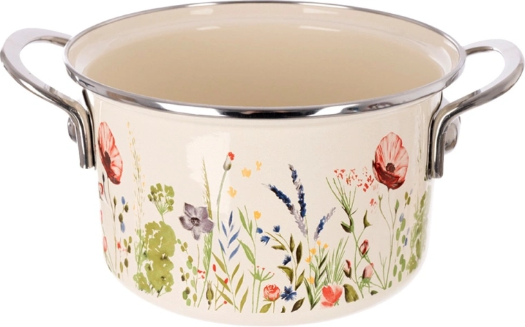 Descoperiți farmecul atemporal al designului retro și practicitatea într-un singur produs. Oala emailată în culoare crem, cu motiv de flori de câmp, va deveni podoaba oricărei bucătării. Datorită oțelului emailat de calitate, distribuie excelent căldura, este durabilă și se curăță ușor. Marginea din inox și mânerele laterale solide asigură manipulare sigură.
