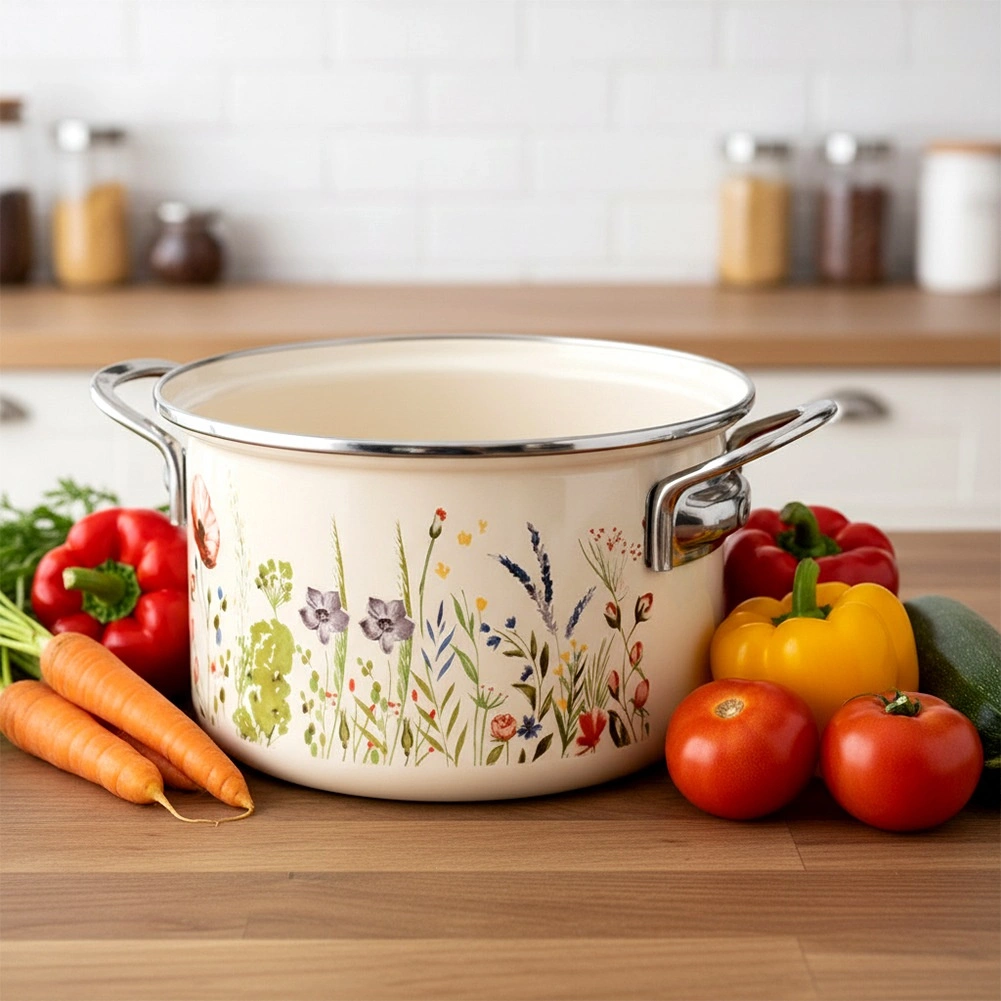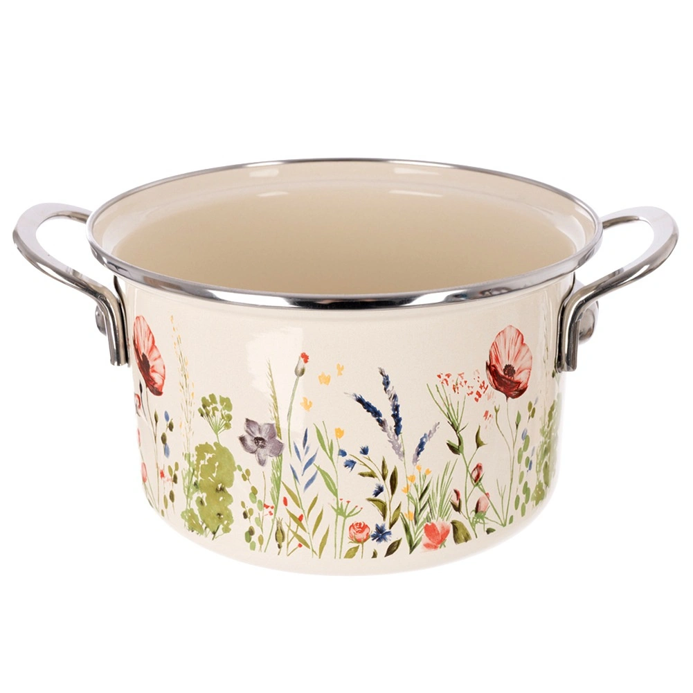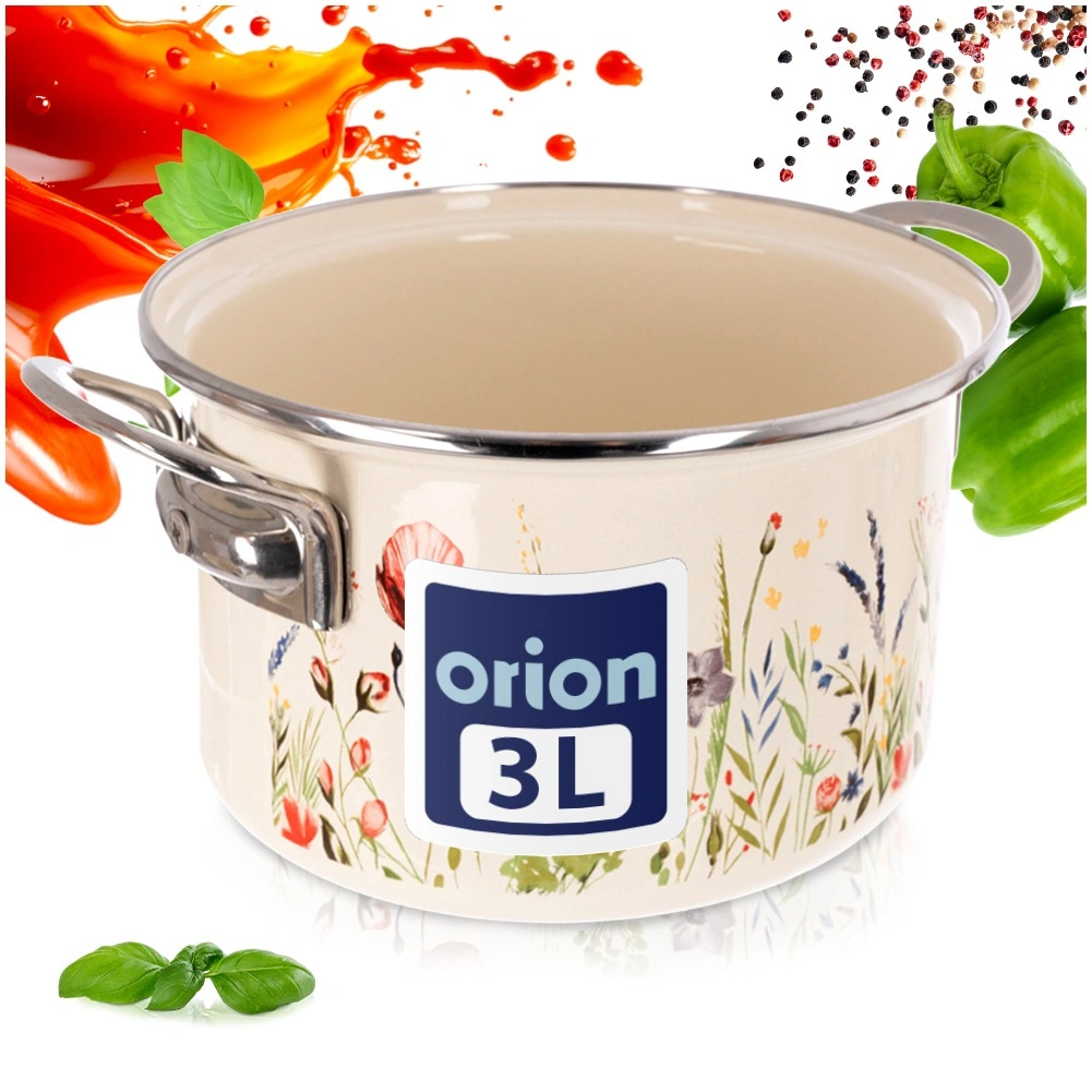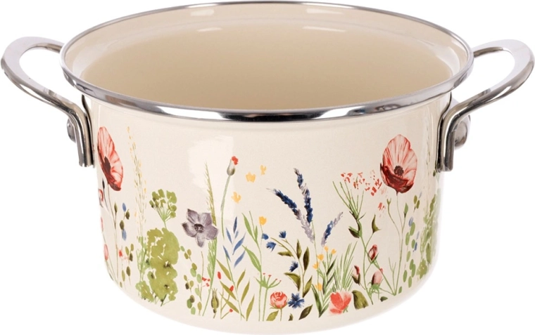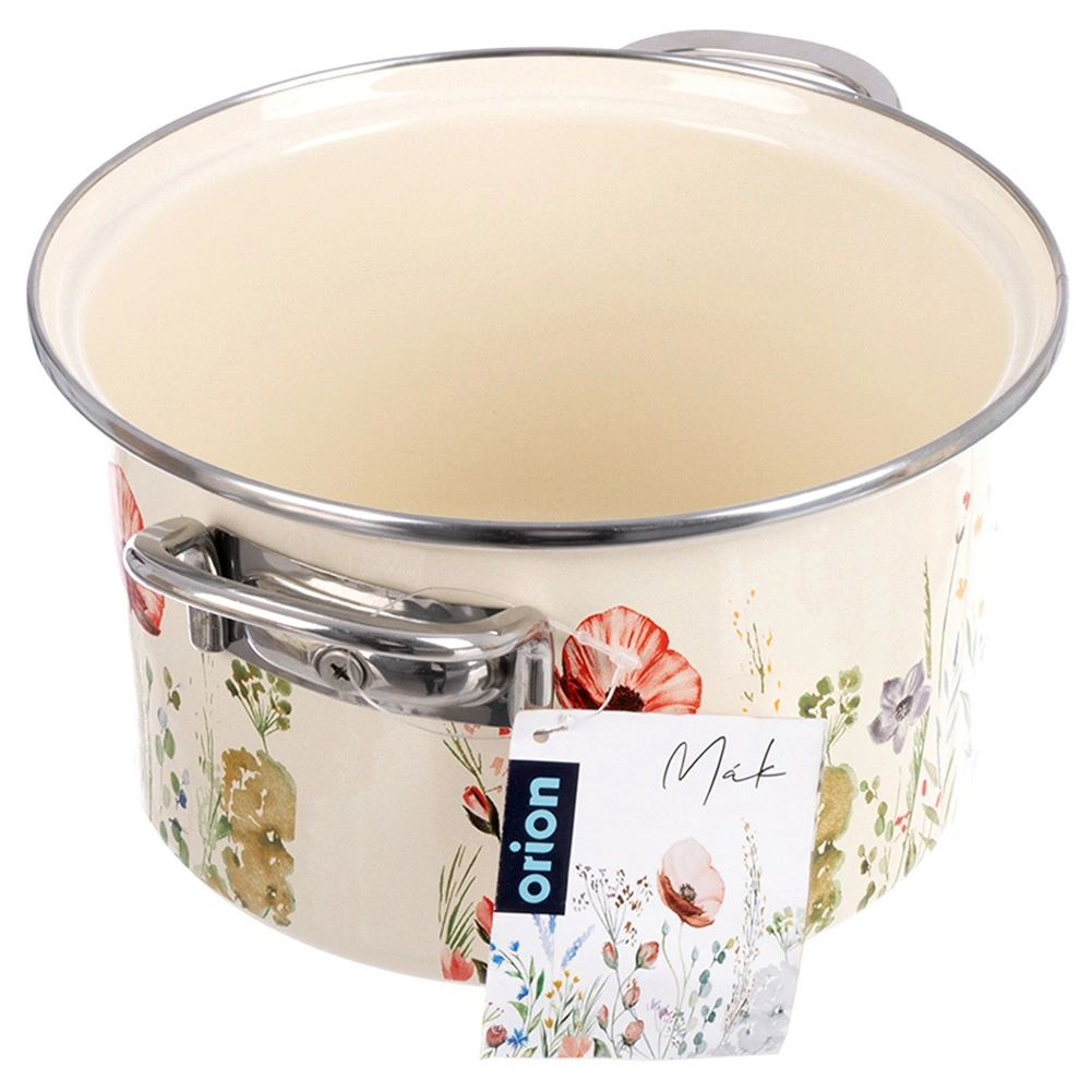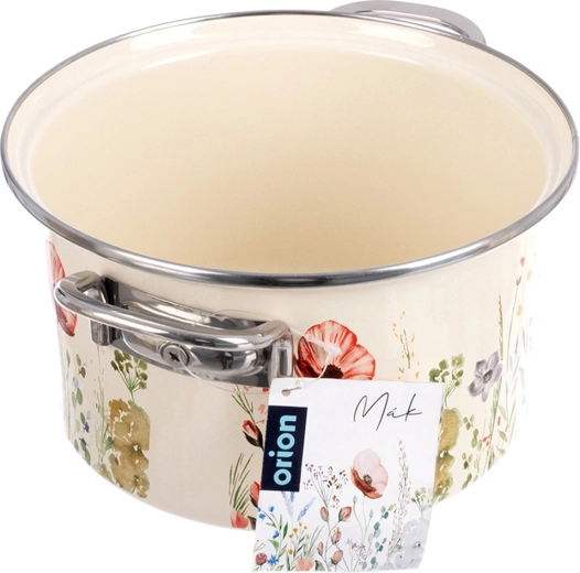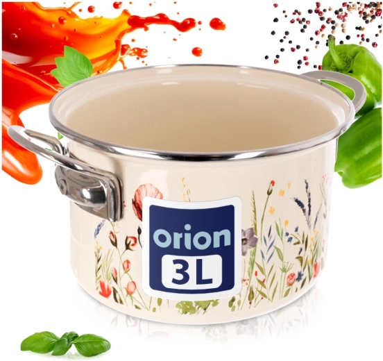 Elegantă oală emailată cu volum de 3 l, în culoare crem, cu motiv de flori de câmp, ideală pentru gătit și înăbușit zilnic. Datorită marginii din inox și mânerelor metalice solide, se manevrează confortabil. Potrivită pentru toate tipurile de plite, inclusiv inducție, cât și pentru cuptor, și se poate spăla în mașina de vase. Aspect tradițional în stil retro și oțel emailat sigur pentru sănătate, de la brandul ceh ORION.
