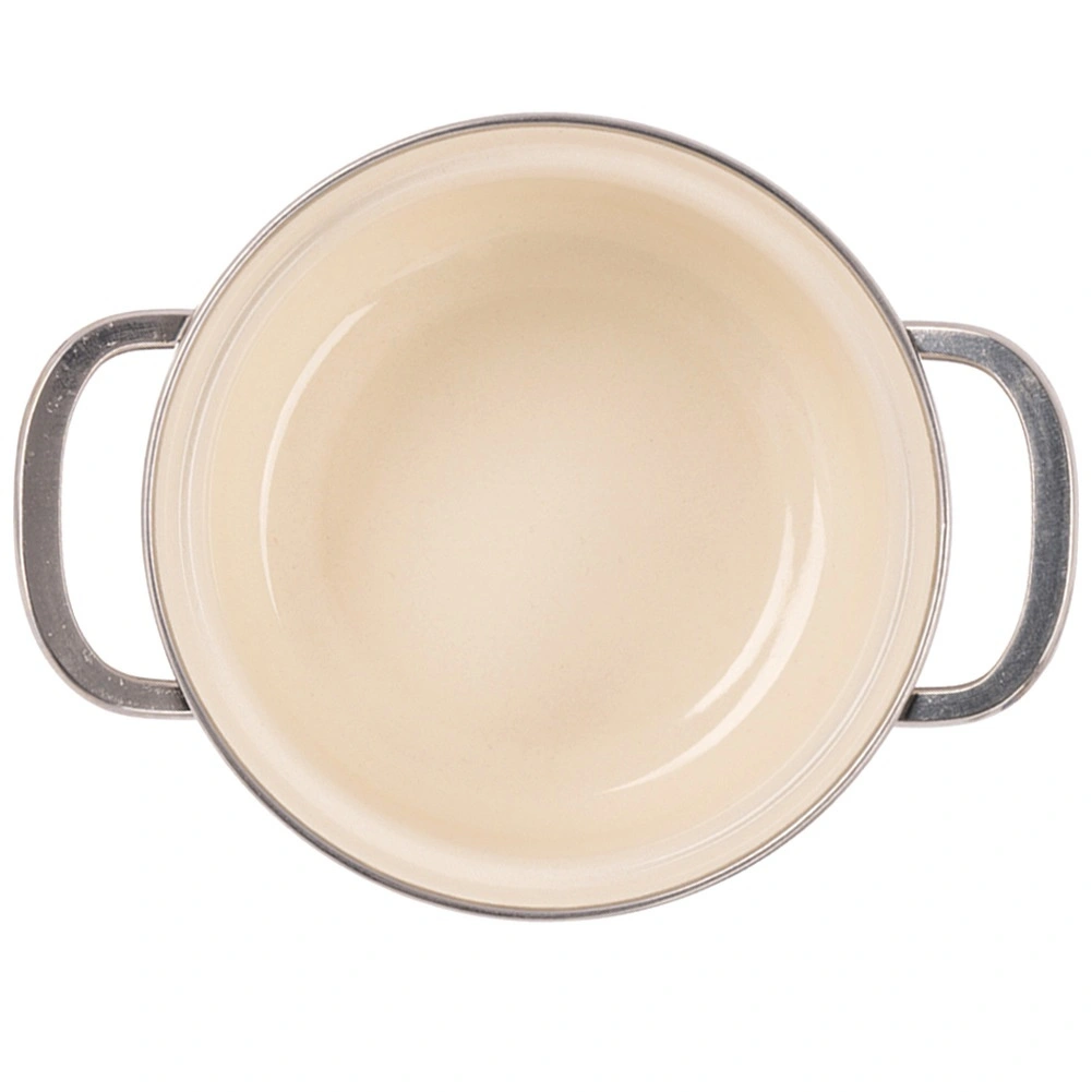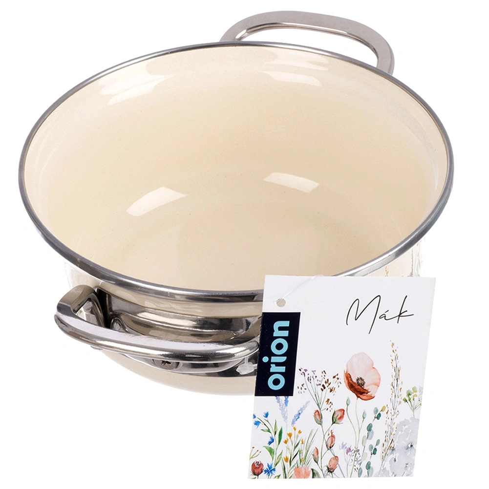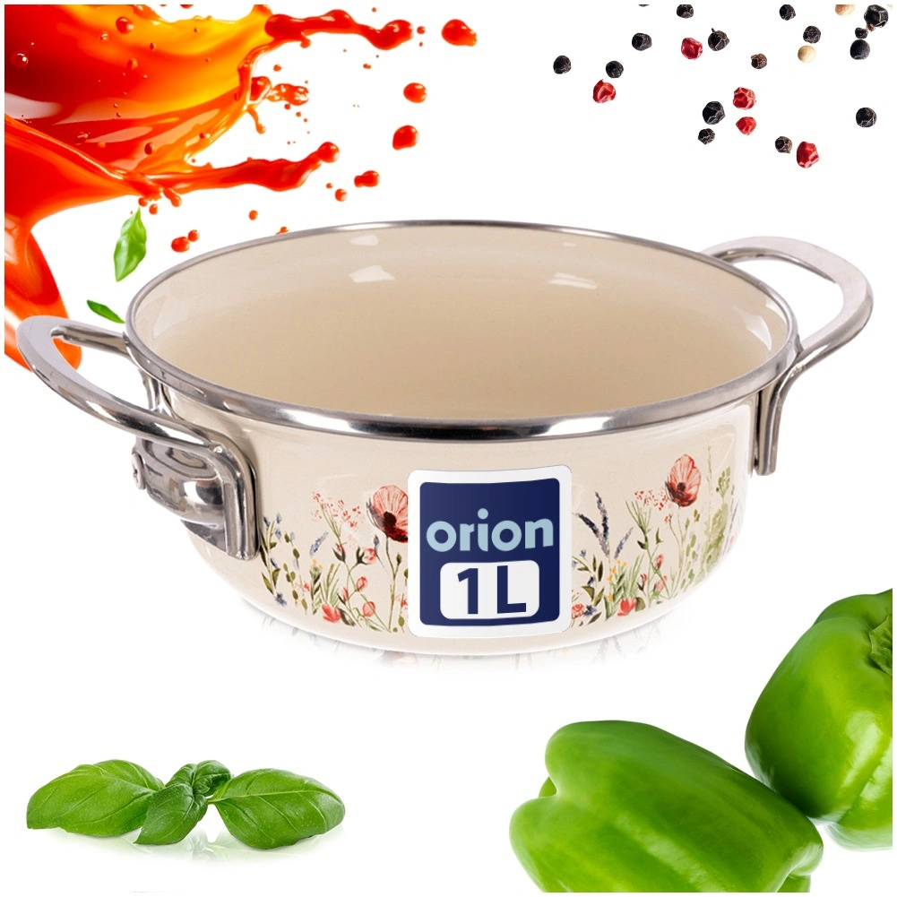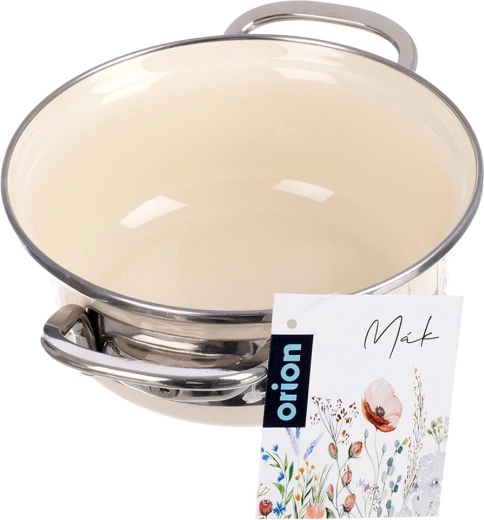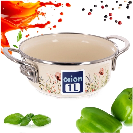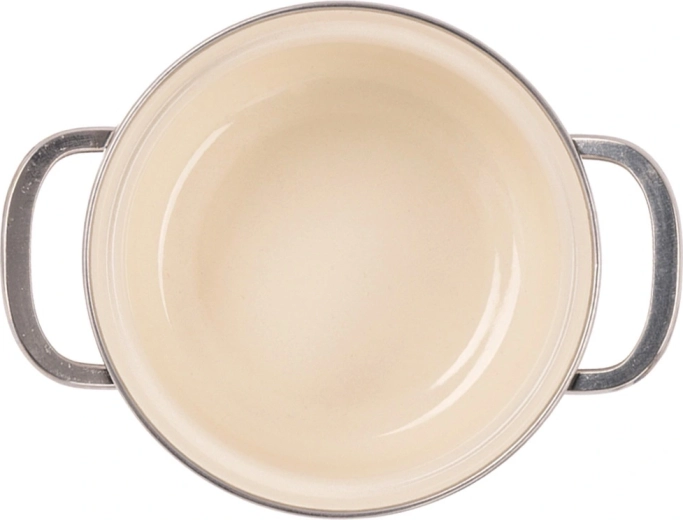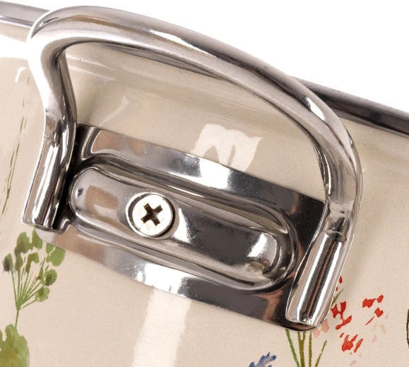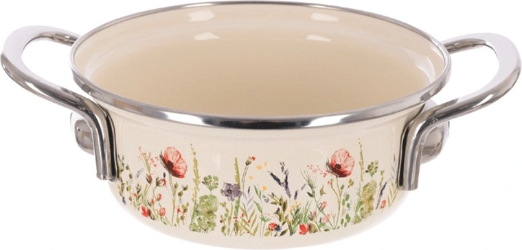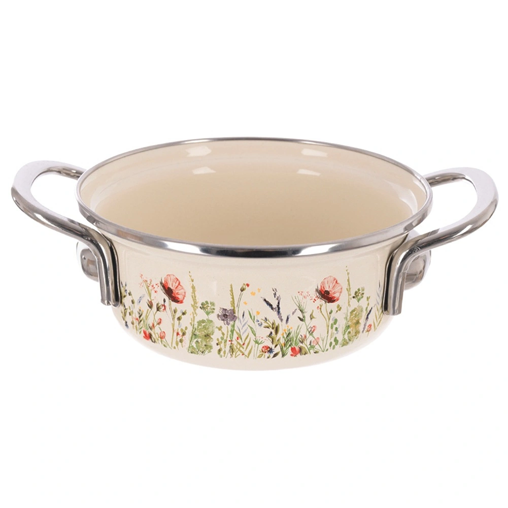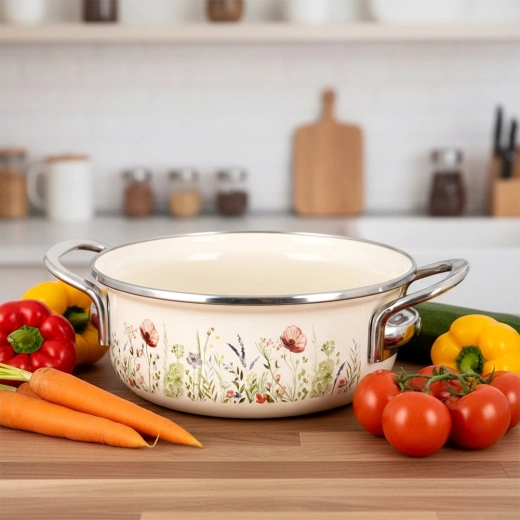 Elegantă oală emailată în culoare crem, cu motiv de flori de câmp, ideală pentru gătit și înăbușit zilnic. Oferă un volum de 950 ml, diametru de 16 cm și două mânere robuste din inox pentru manipulare în siguranță. Potrivită pentru toate tipurile de plite, inclusiv inducție, pentru cuptor și pentru mașina de spălat vase. Emailul, sigur pentru sănătate, este de asemenea prietenos cu persoanele alergice.