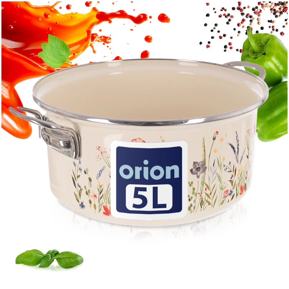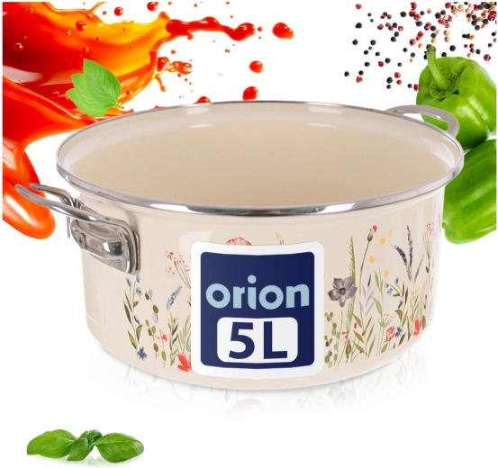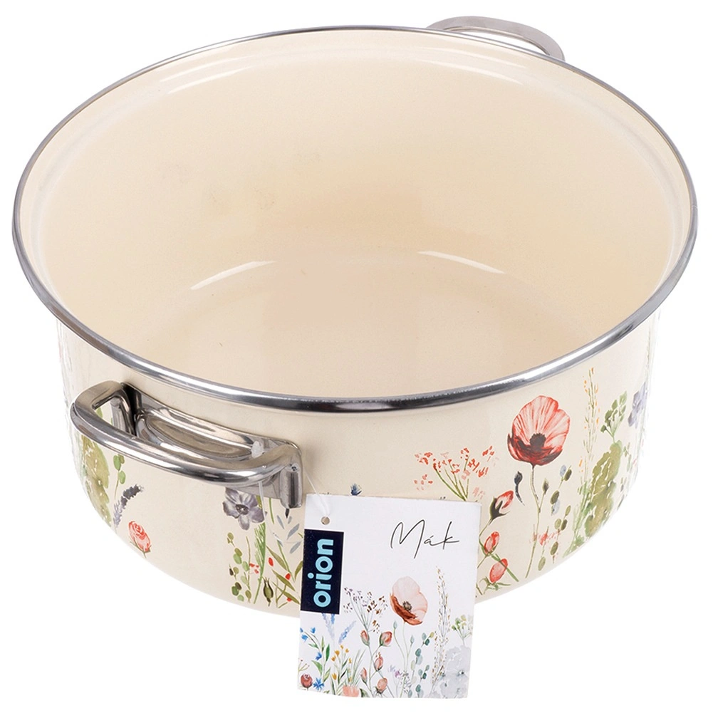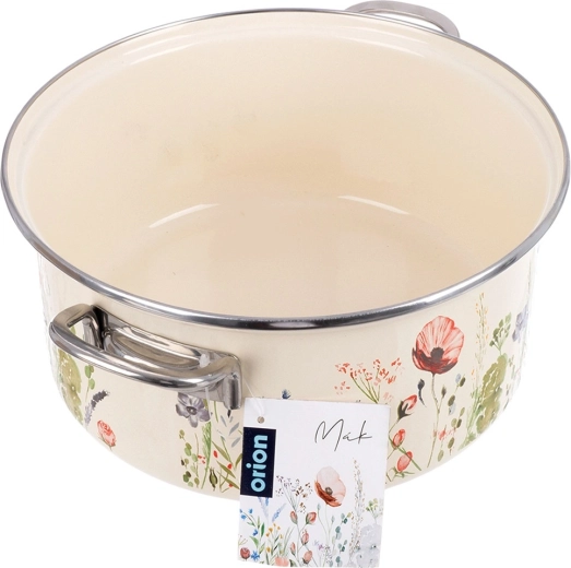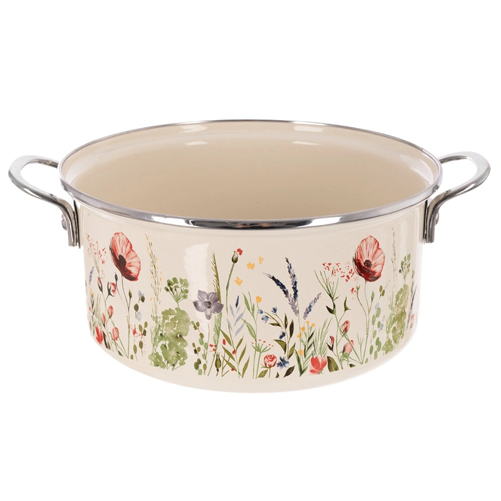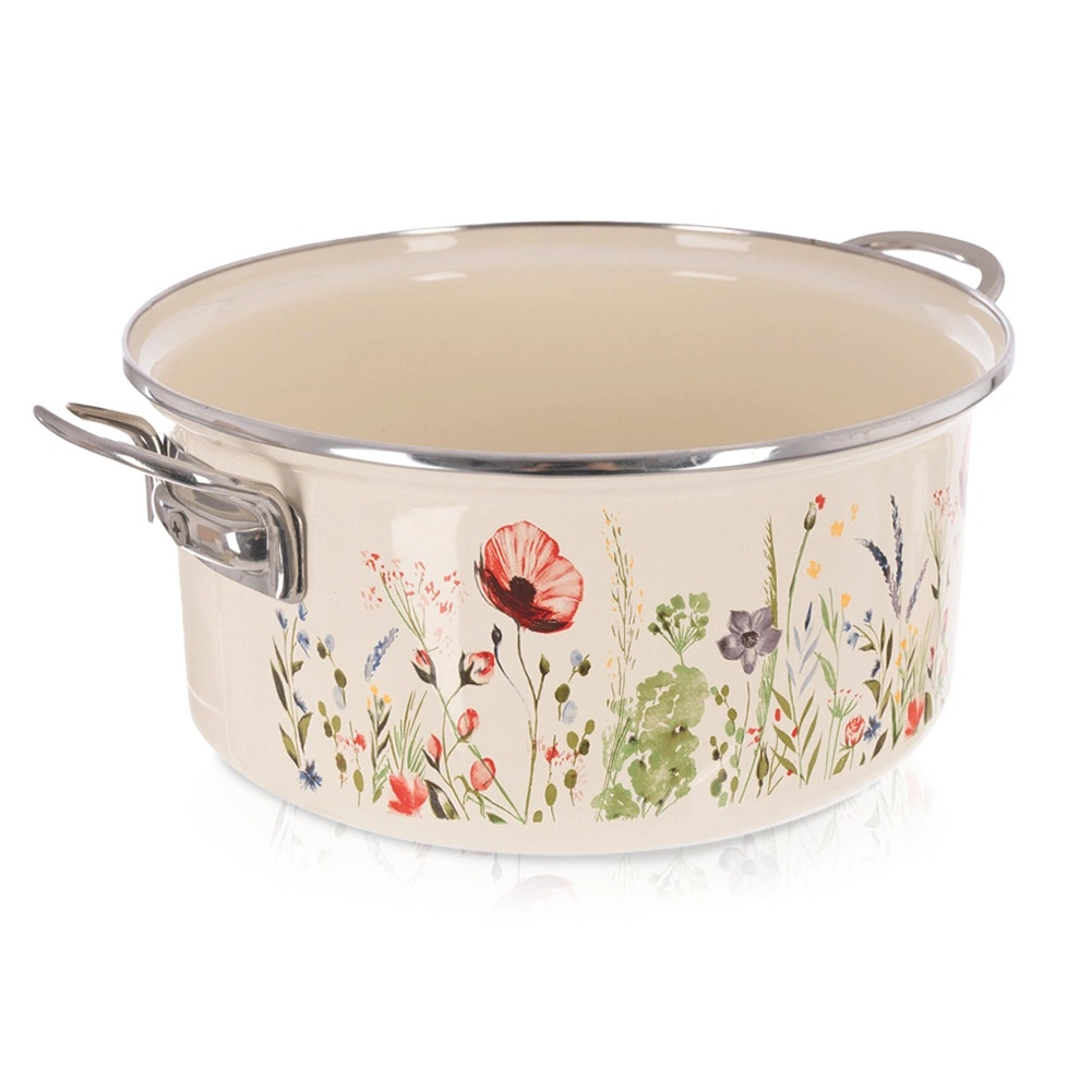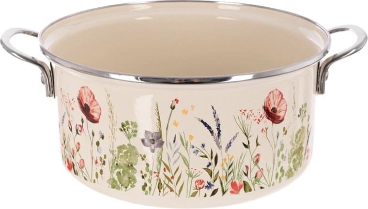 Oala îndrăgită în stil retro combină durabilitatea smalțului cu practicitatea de zi cu zi. Volumul de 5 l, diametrul de 26 cm și înălțimea de 12 cm oferă spațiu suficient pentru supe, sosuri și porții pentru familie. Finisajul crem cu decor floral înfrumusețează bucătăria și masa, astfel încât puteți servi mâncarea direct în ea.
