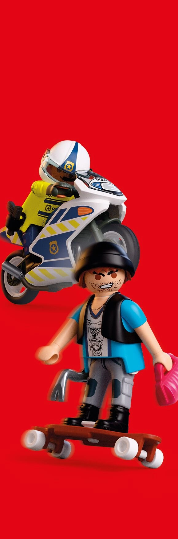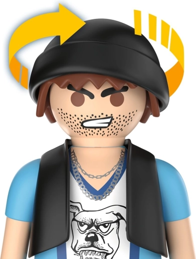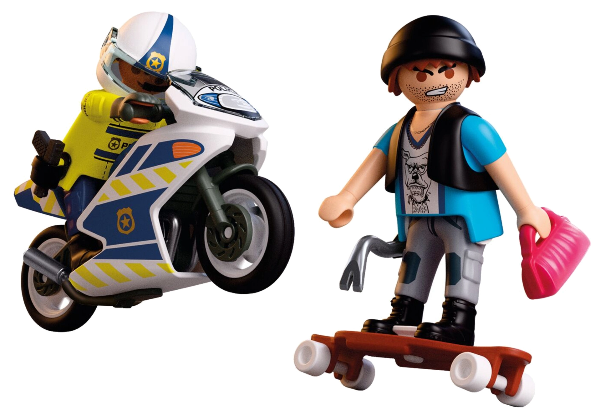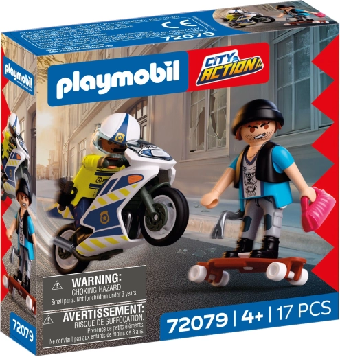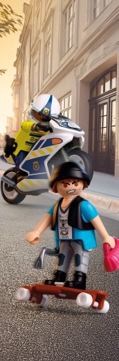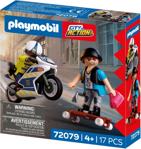 Bucură-te de acțiune polițienească dinamică: curajosul polițist pornește pe motocicleta de serviciu într-o urmărire rapidă pe străzile orașului, în timp ce hoțul fuge pe skateboard cu prada. Motocicleta stabilă cu cric rabatabil și figurinele mobile asigură un joc cursiv și sigur.