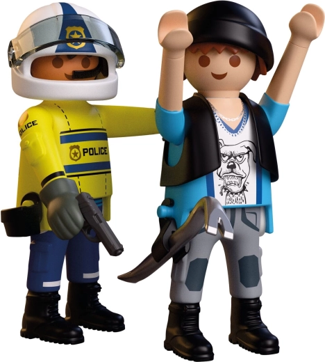 Polițist cu vestă reflectorizantă și echipament, hoț cu cască și accesorii. Membre mobile și imprimeuri autentice care susțin jocul creativ.